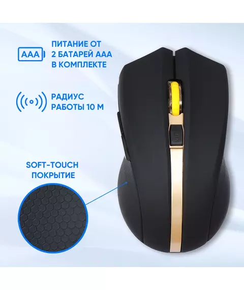 | Особенности | Удобная беспроводная компьютерная мышь. Возможность настройки оптимального разрешения. Покрытие soft-touch. Специальное ПО расширяющее функциональные возможности мышки. |
