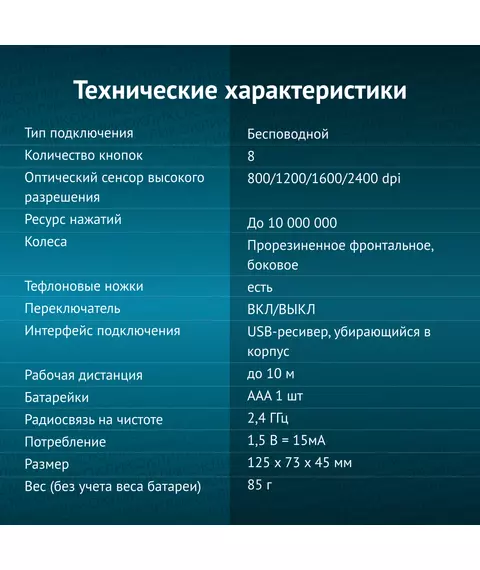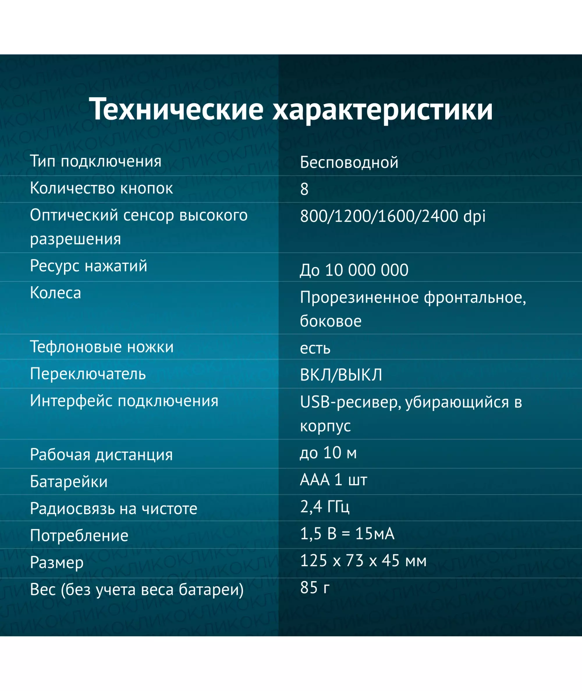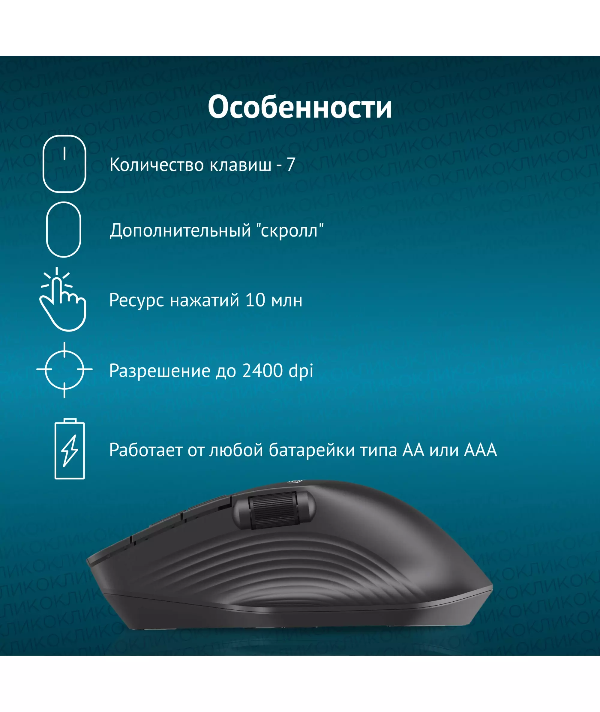 | Особенности | Эргономичная беспроводная компьютерная мышь с удобным дополнительным функционалом кнопок. Дополнительное боковое колесо прокрутки. Настраиваемое оптимальное разрешение. Надежные высокоресурсные кнопки (10 млн. кликов). Конструкция мышки позволяет использовать любую батарейку - АА или ААА. |
