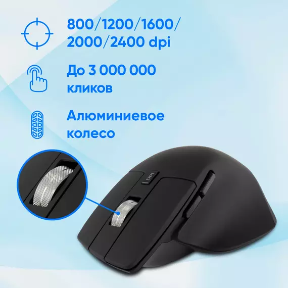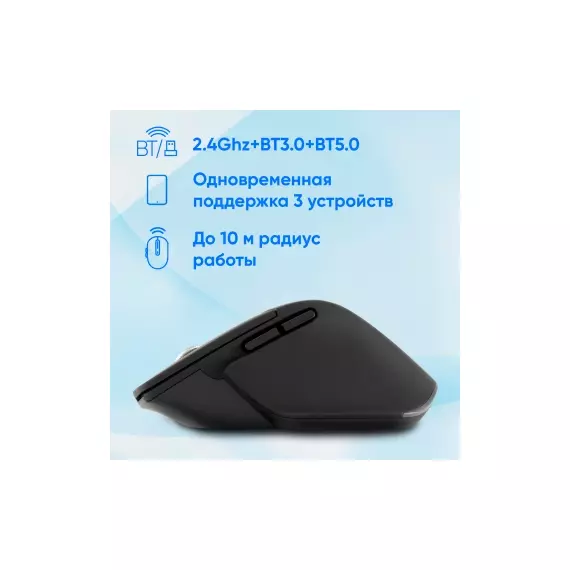 | Особенности | Удобная эргономичная беспроводная мышь. Покрытие soft-touch, металлическое колесо, тефлоновые ножки, поддержка трех устройств, бесшумный клик. Универсальный ресивер USB A/C, поддержка Bluetooth. Кнопка вкл/выкл, кнопка переключения между устройствами на нижней поверхности мышки. Специальное ПО. |