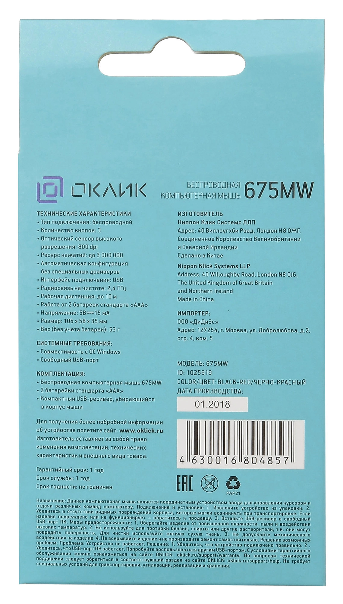 Oklick 675MW оснащена автоматической конфигурацией без специальных драйверов, что делает его простым в установке и использовании.