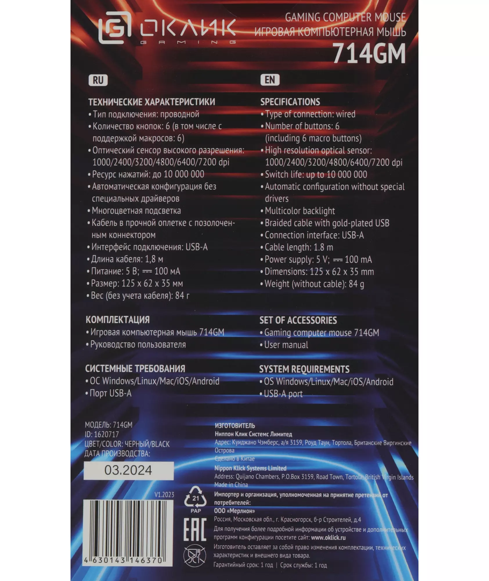 Мышь Oklick 714GM черный оптическая 7200dpi USB 6but RTL [1620717]
