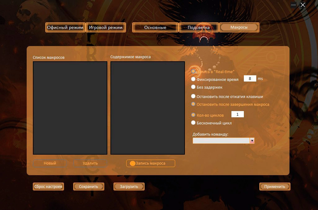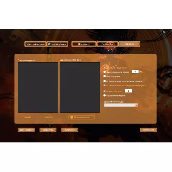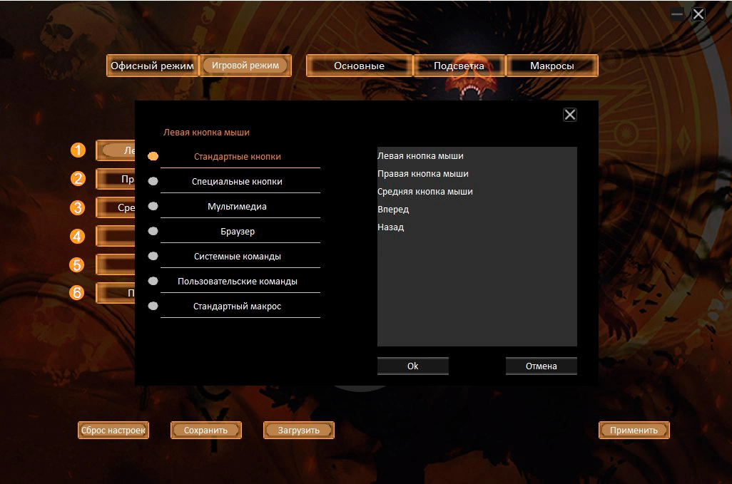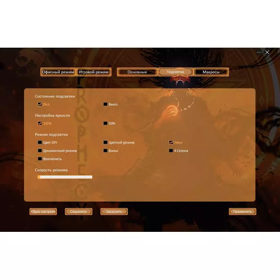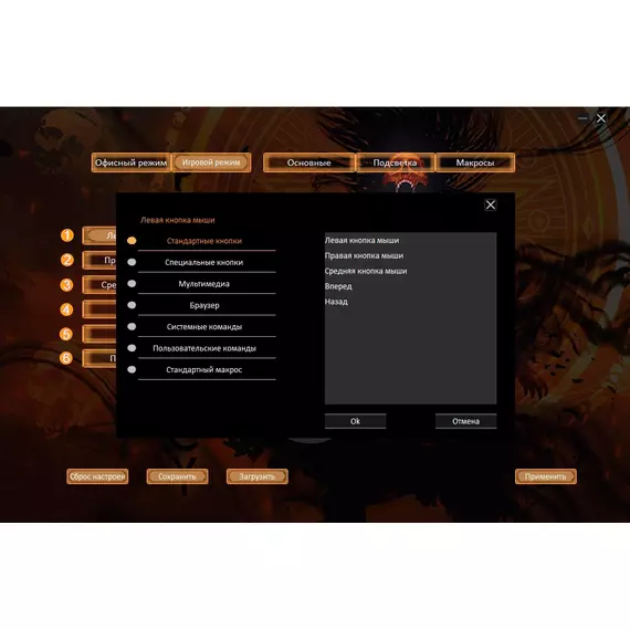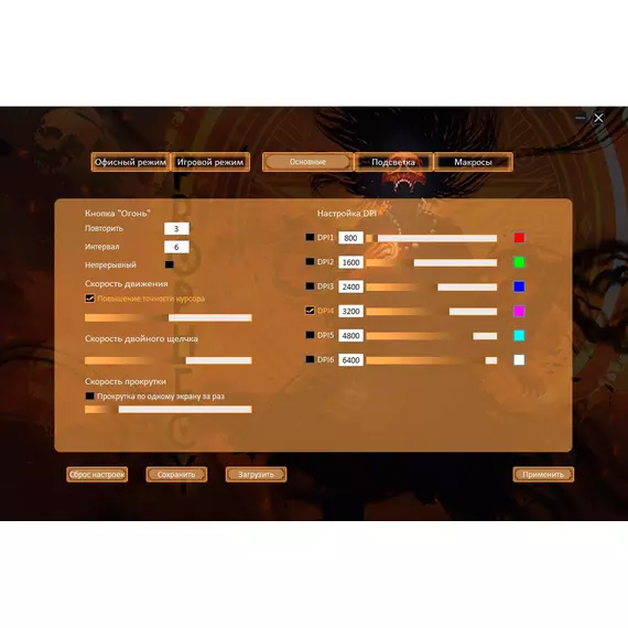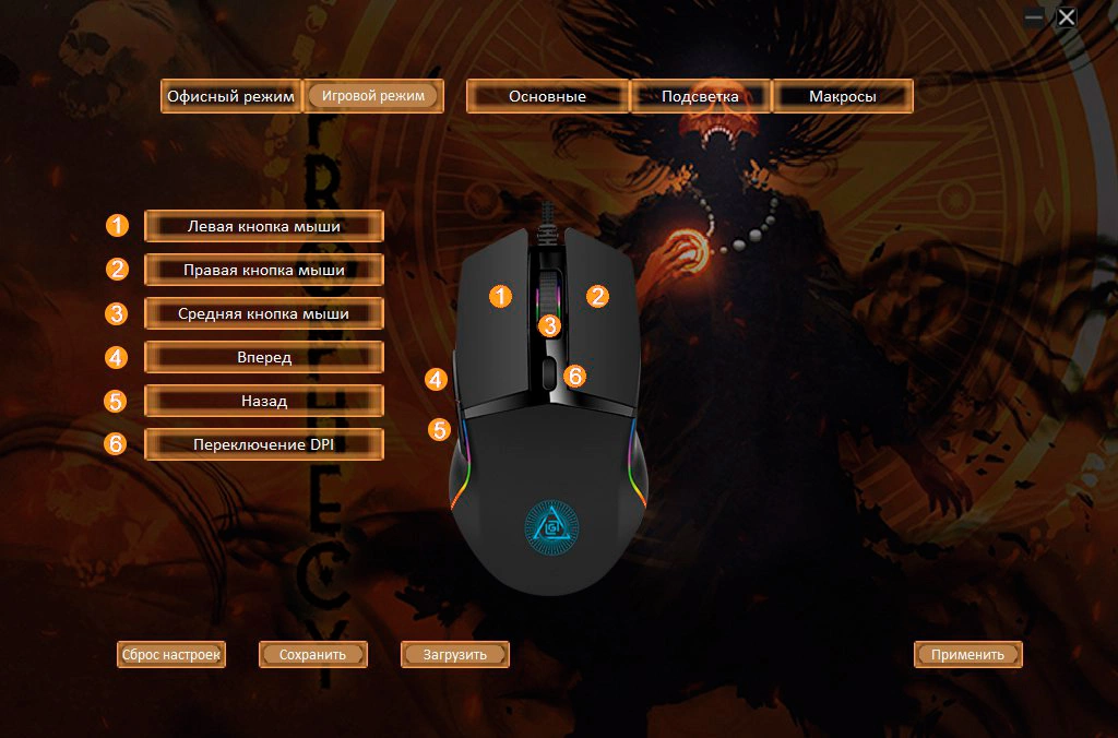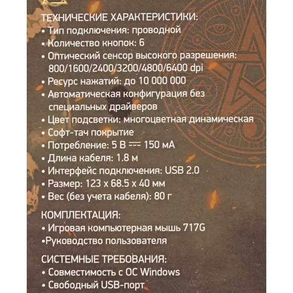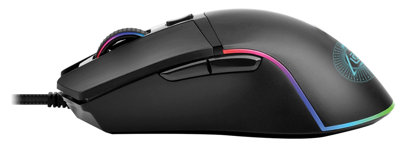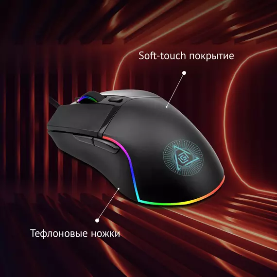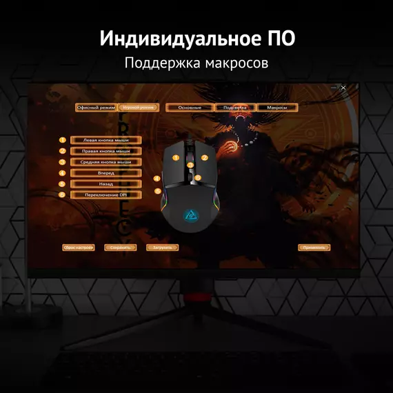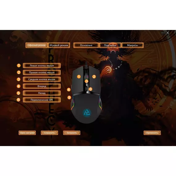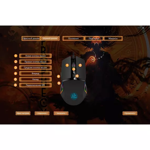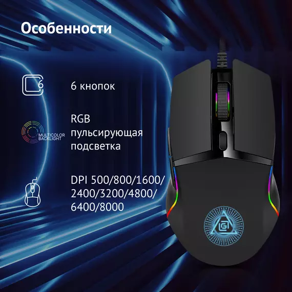 | Особенности | Специальное ПО. Игровой и офисный режимы. Сенсор до 8000 DPI.Программируемая RGB подсветка,с возможность настройки яркости и скорости,и отключением.UV- покрытие. 6 программируемых кнопок с настройкой макросов. Тефлоновые ножки. Прорезиенное колесо. Кабель в прочной оплетке с магнитным фильтром. |