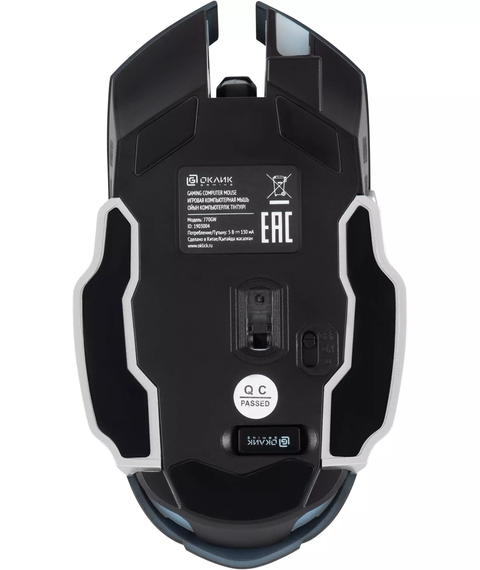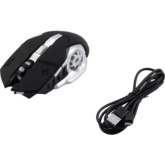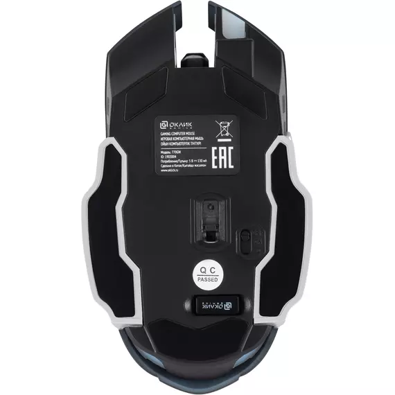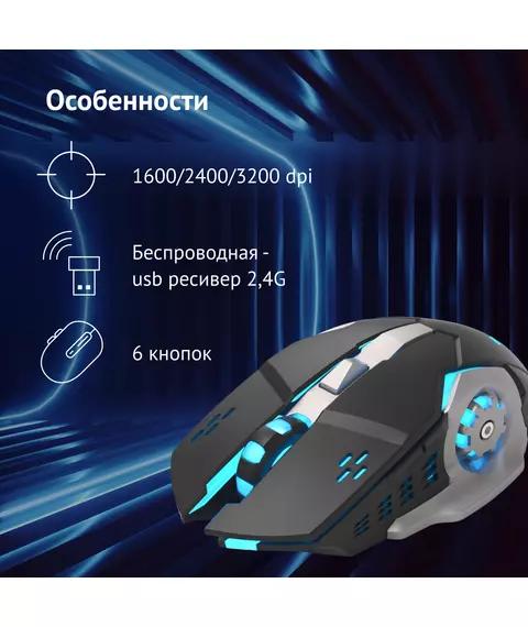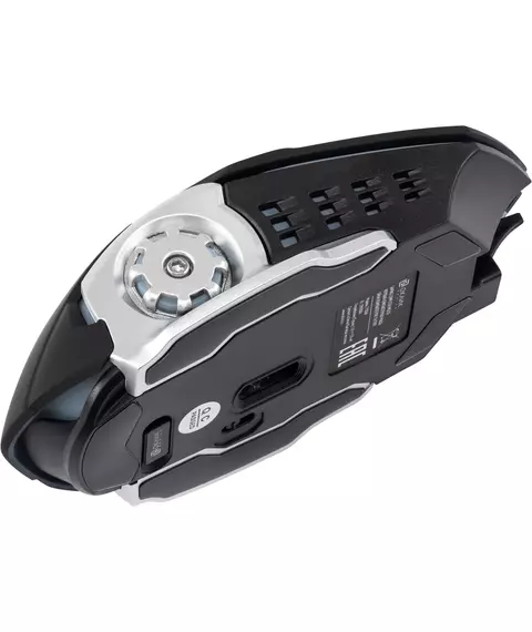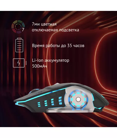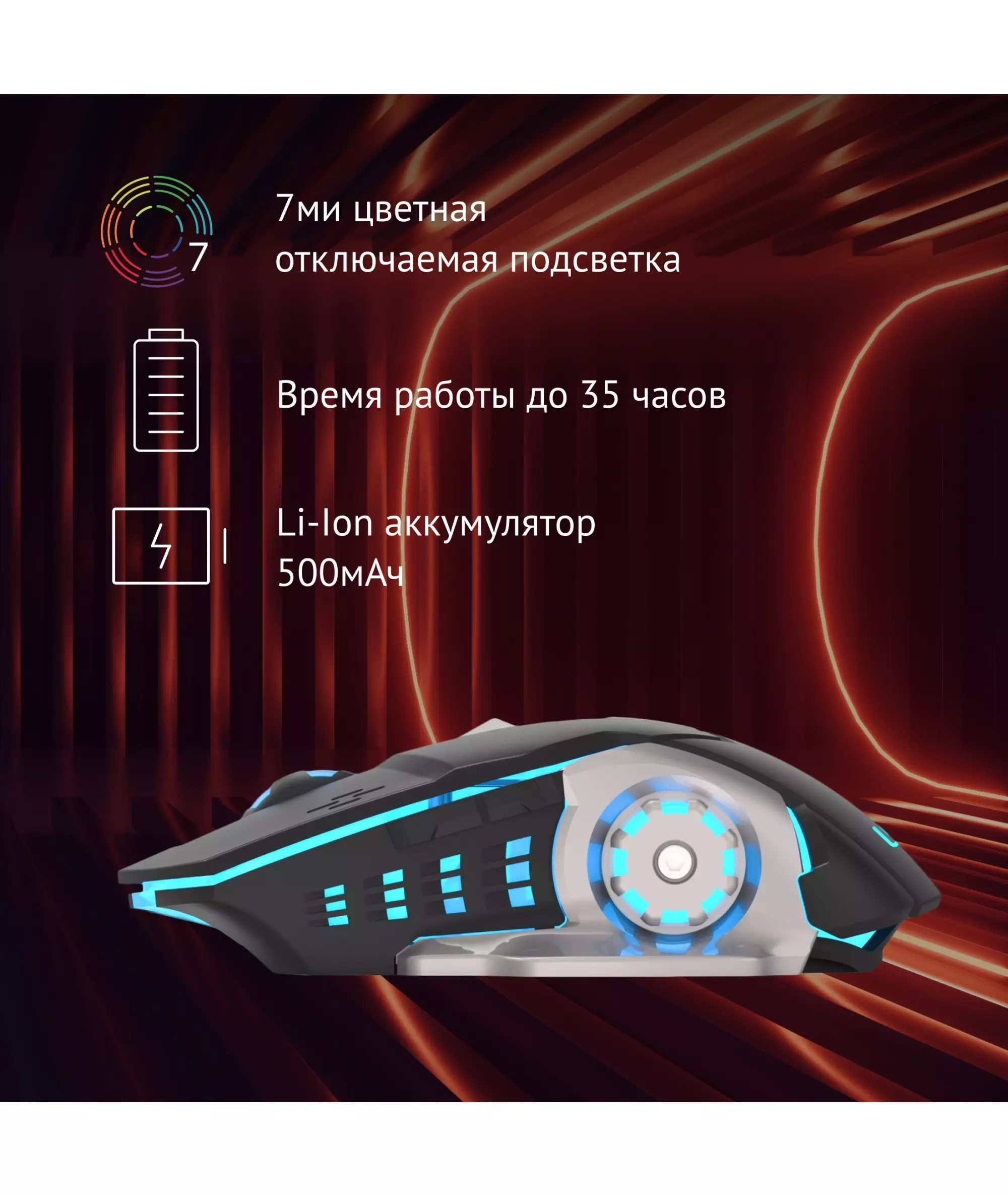 | Особенности | Беспроводная компьютерная мышь. Встроенный Li-Ion аккумулятор на 500mAh,тефлоновые ножки для лучшего скольжения, многоцветная подсветка (с возможностью отключения), настройка оптимального разрешения |