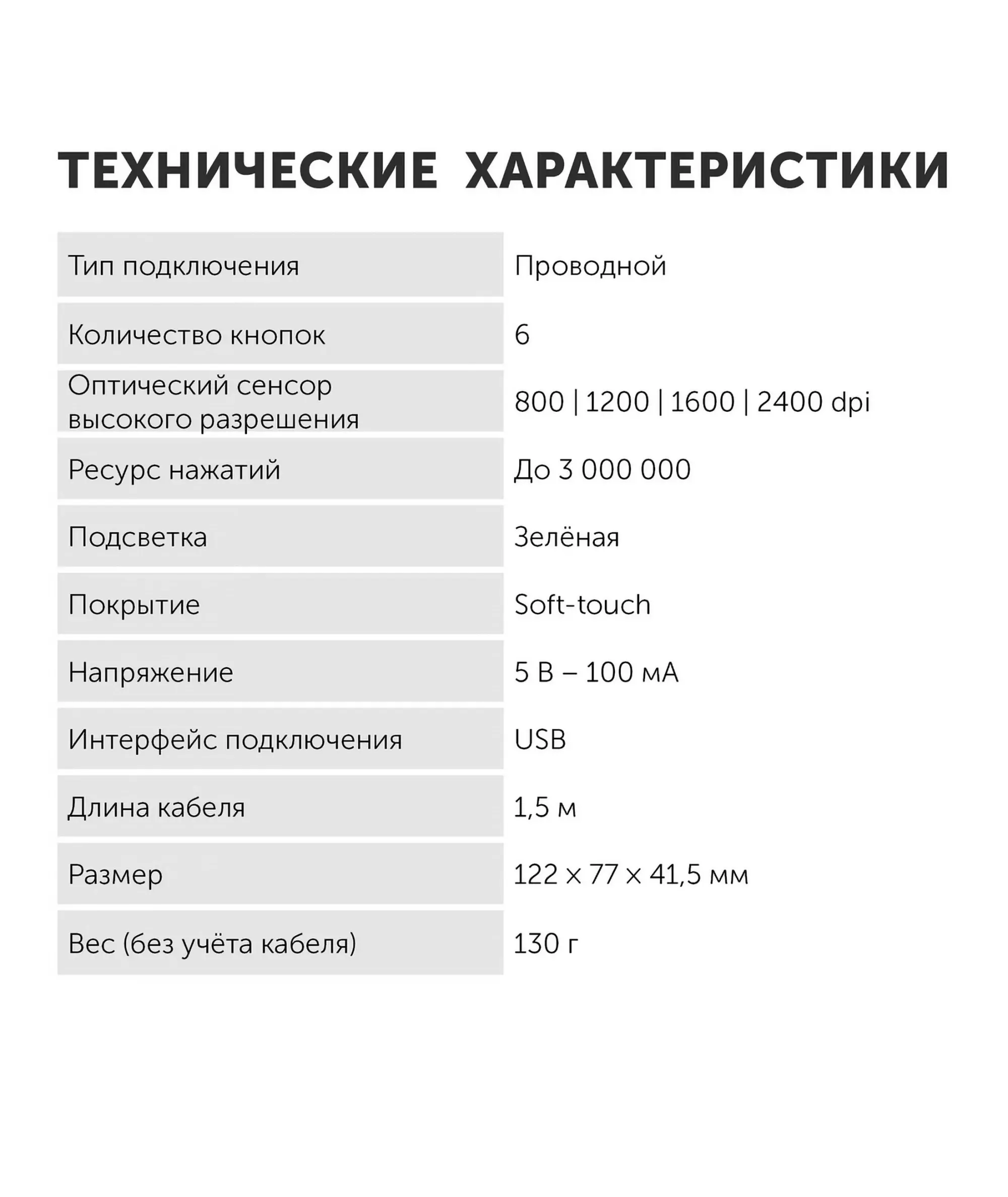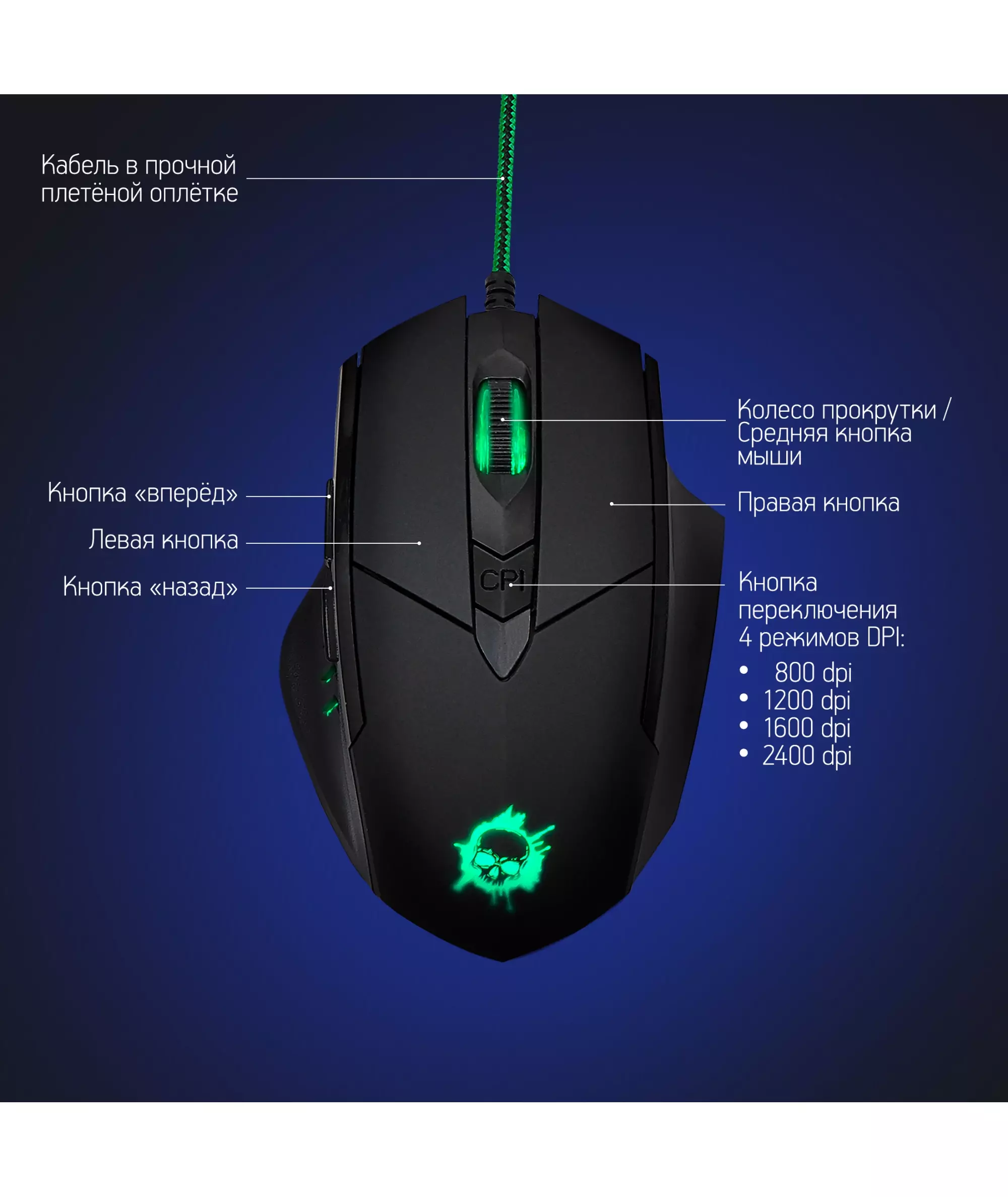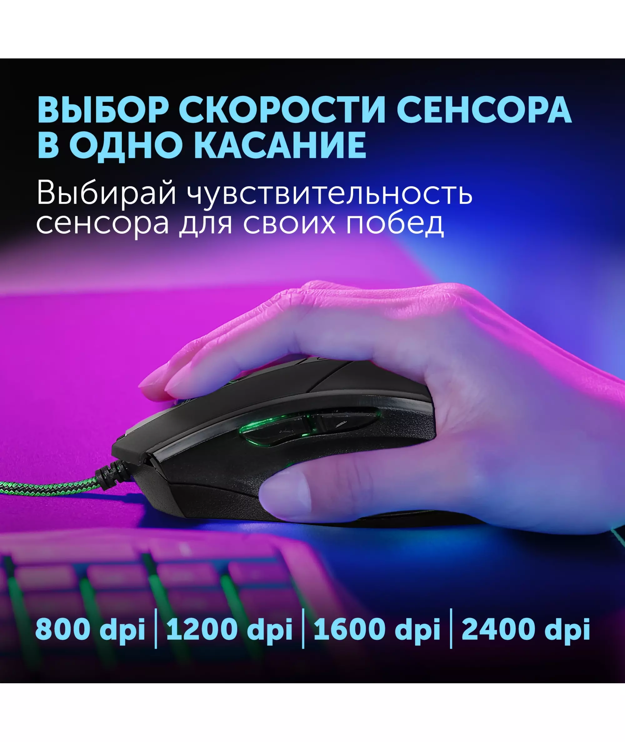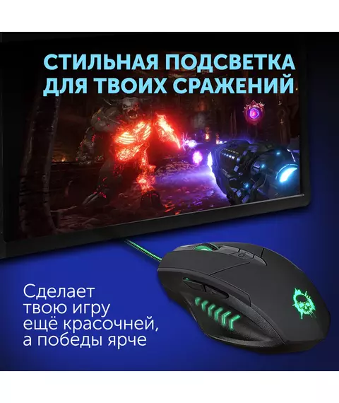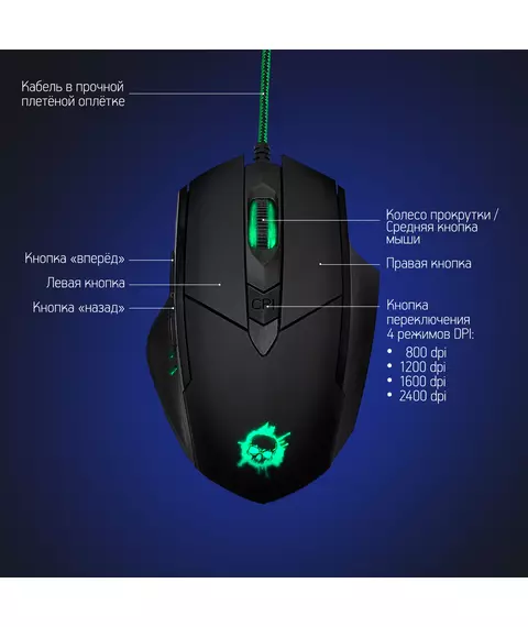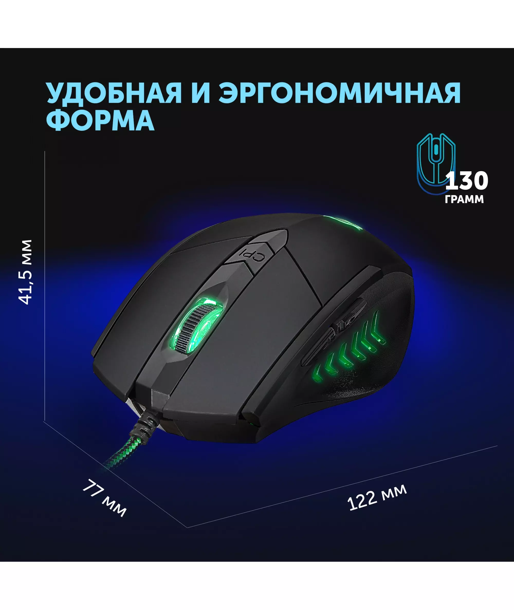 | Особенности | Игровая компьютерная мышь с подсветкой. Возможность выбора оптимального разрешения. Покрытие soft-touch. Провод в оплетке. Специальное ПО расширяющее функциональные возможности мышки. В комплекте с ковриком. |