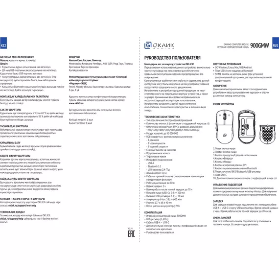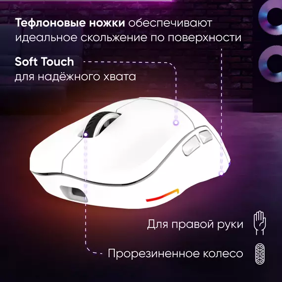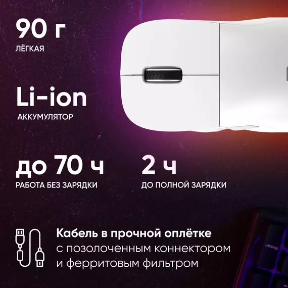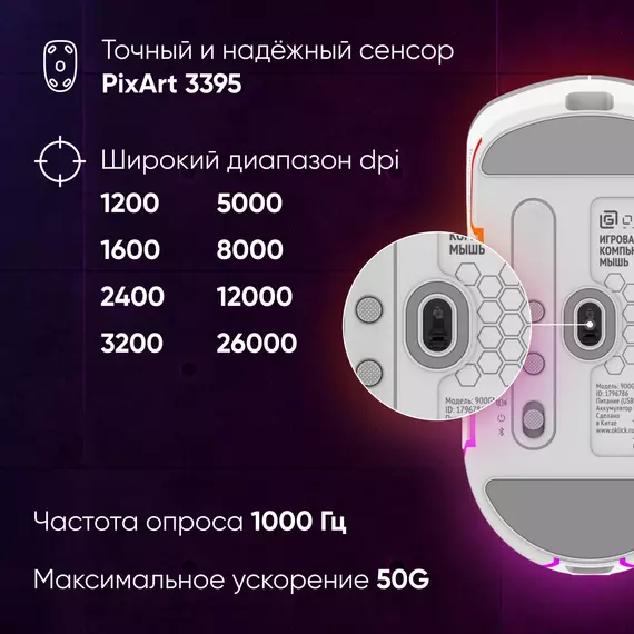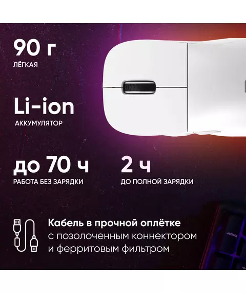 | Особенности | Сенсор PixArt PAW3395. Три режима - 2,4G + BlueTooth + провод, 600 mAh, 50 млн кликов, RGB. ПО для дополнительной настройки. |