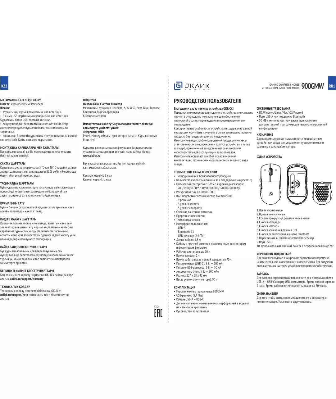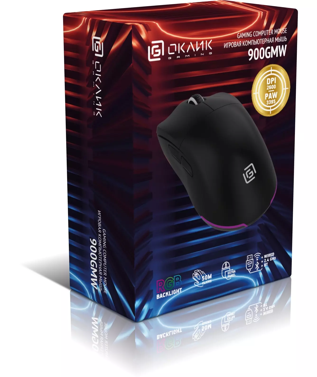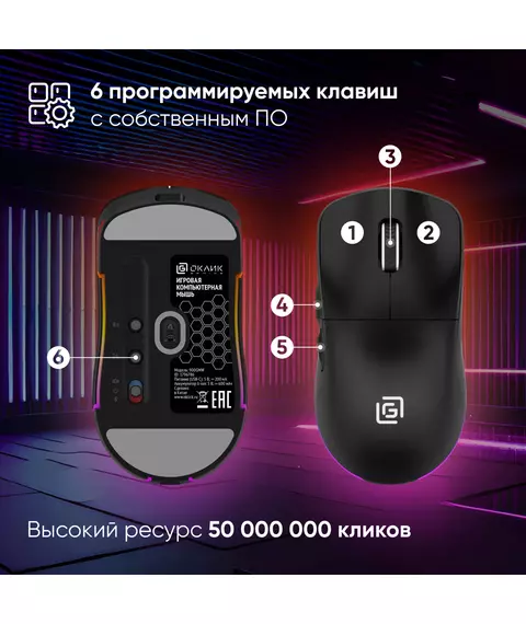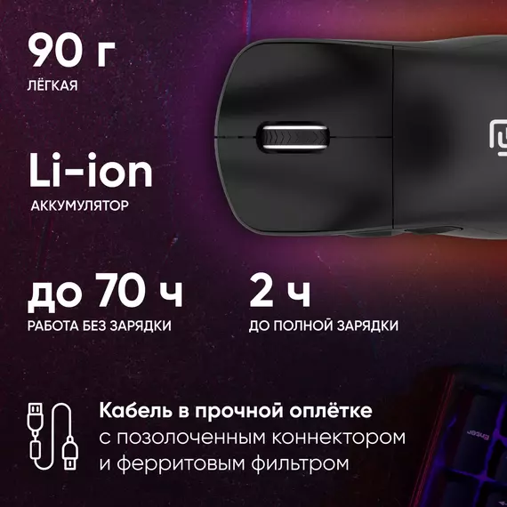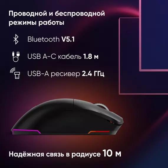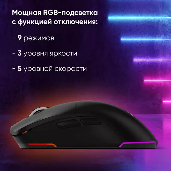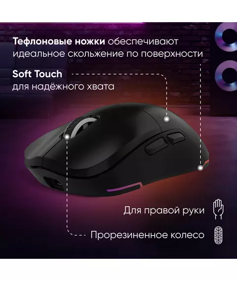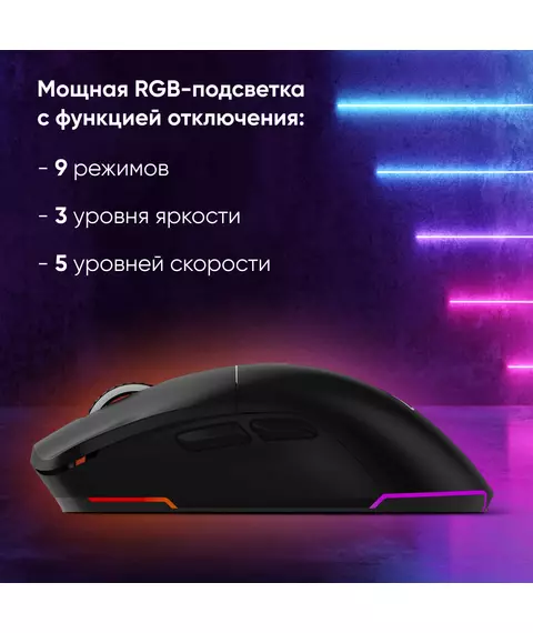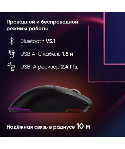 | Особенности | Сенсор PixArt PAW3395. Три режима подключения - 2,4G + BlueTooth + провод, 600 mAh, 50 млн кликов, RGB. ПО для дополнительной настройки. |