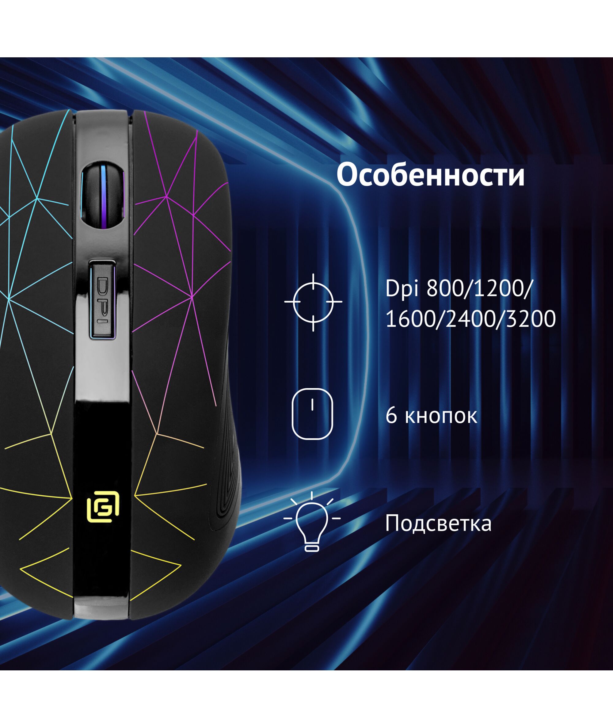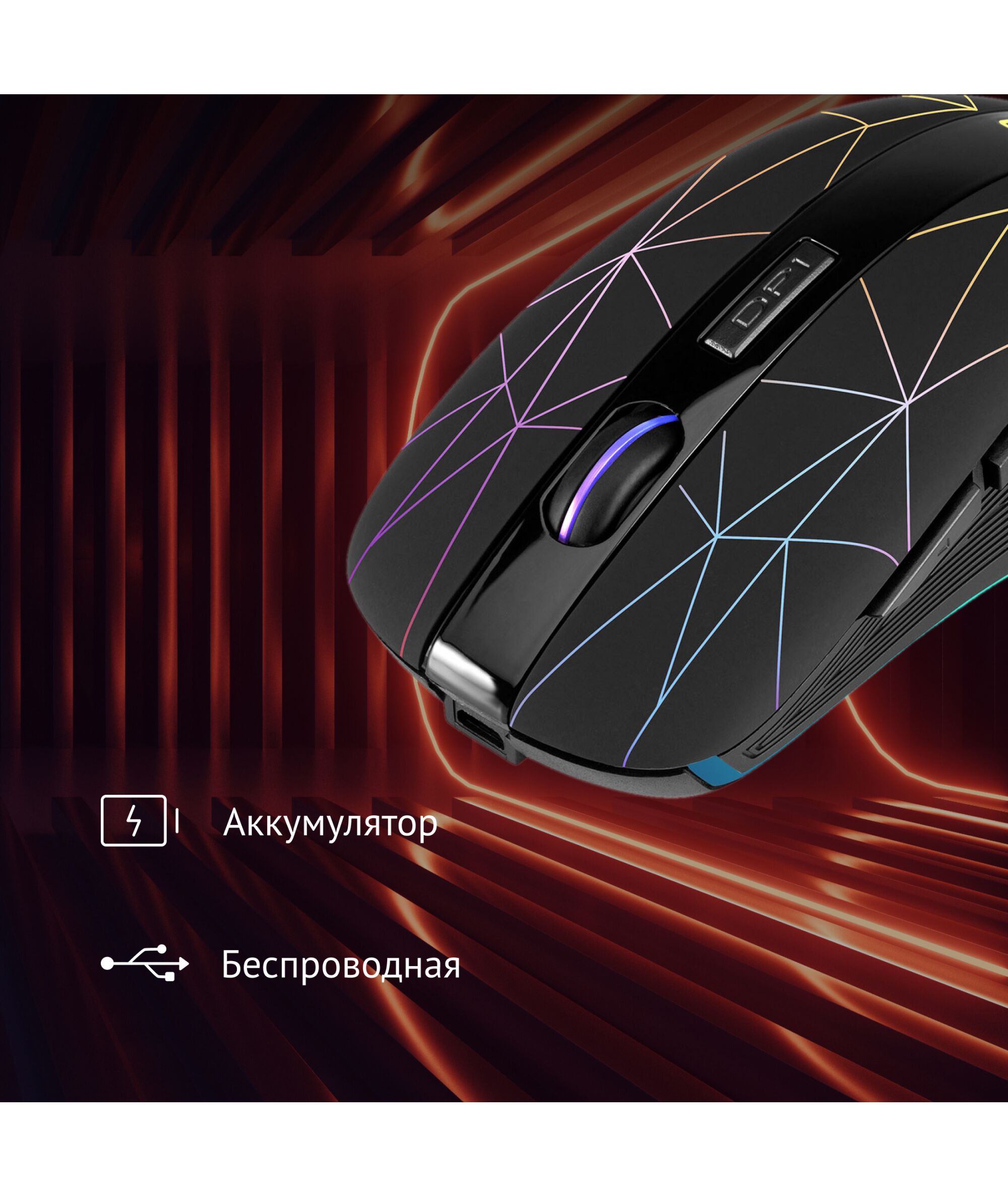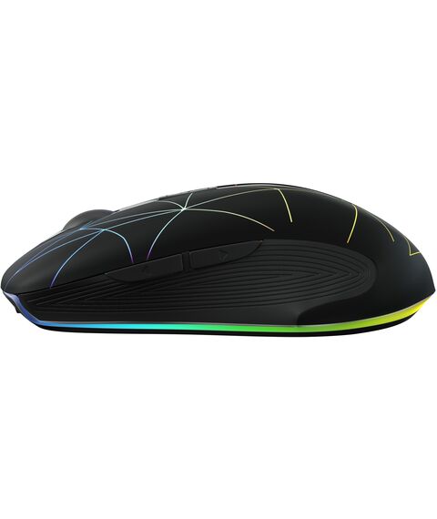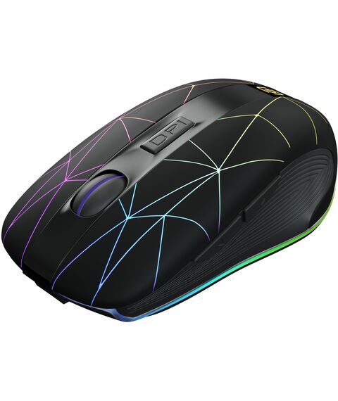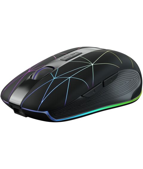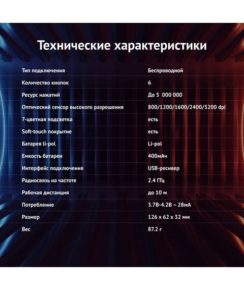| Особенности | Беспроводная компьютерная мышь. Встроенный Li-Ion аккумулятор на 400mAh,тефлоновые ножки для лучшего скольжения, многоцветная подсветка (с возможностью отключения), настройка оптимального разрешения. Специальное ПО расширяющее функциональные возможности мышки. |