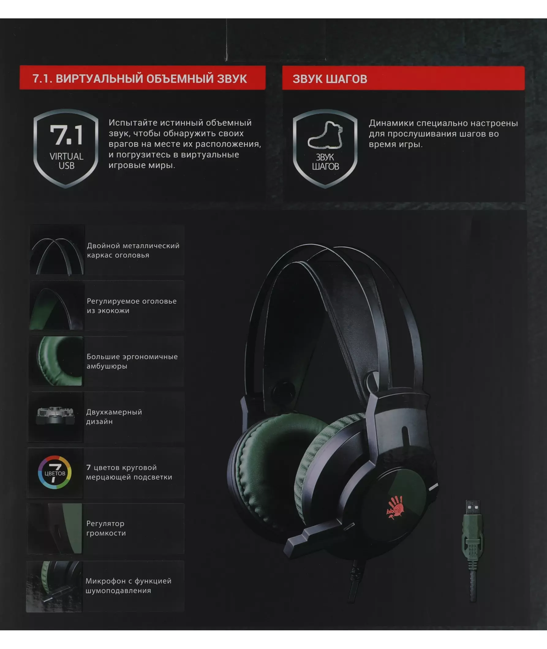 | Особенности | 7 цветов круговой мерцающей подсветки, неспутывающийся usb-кабель |