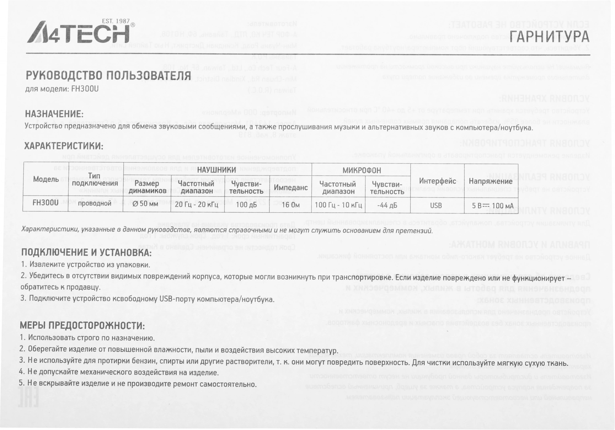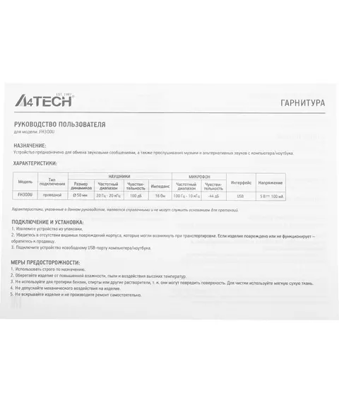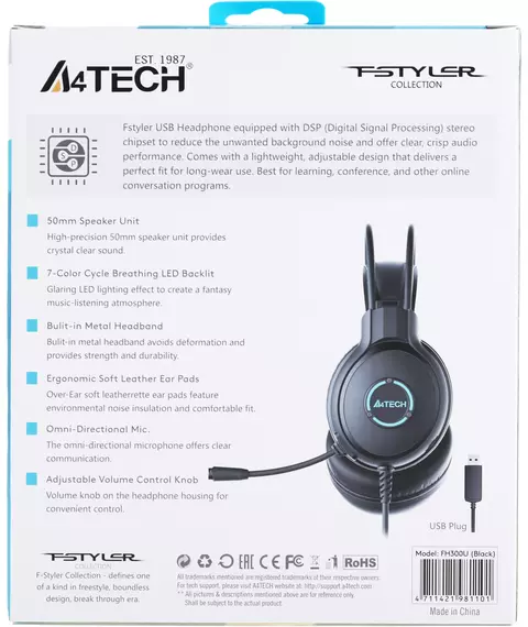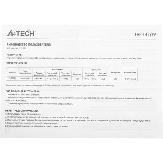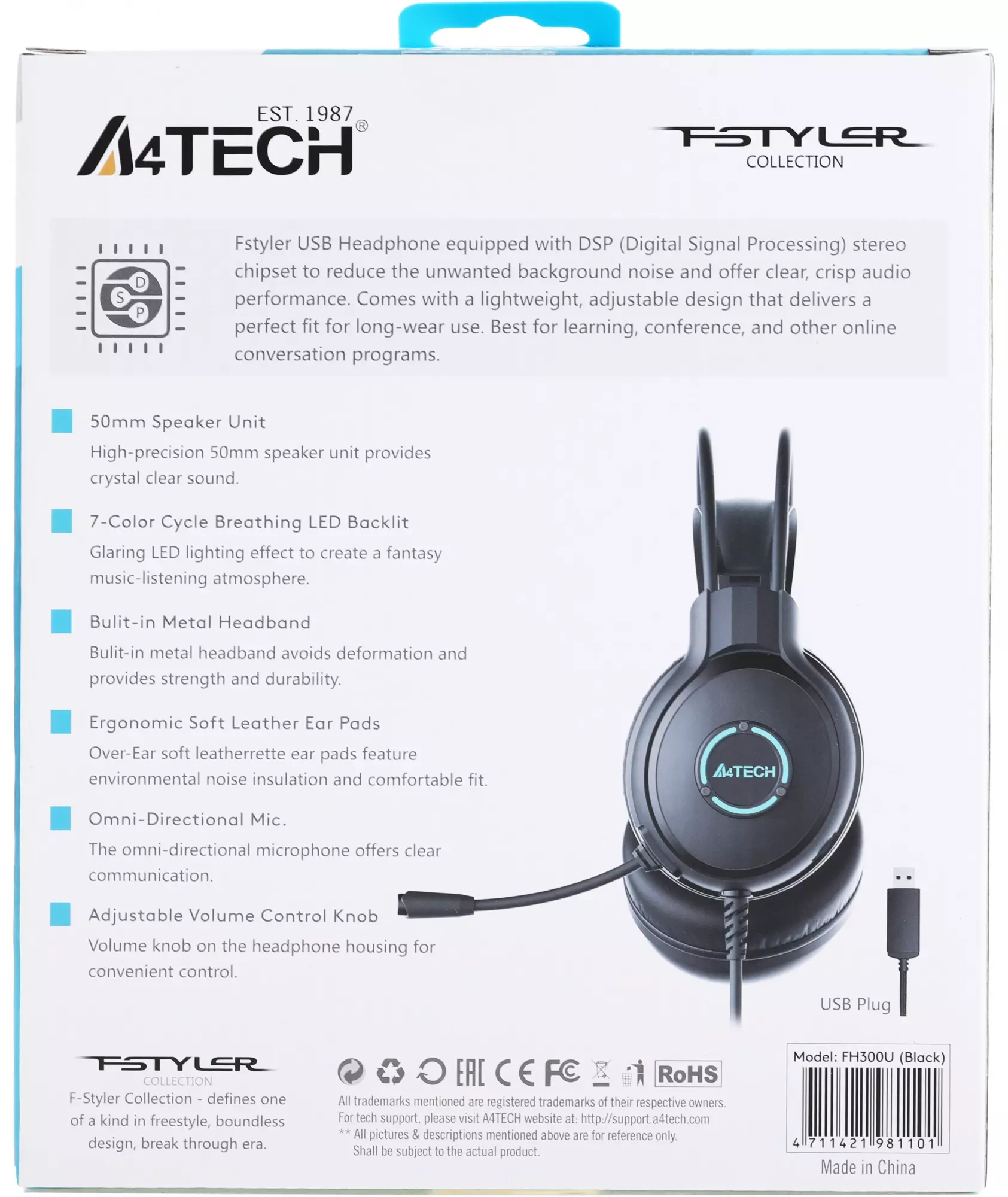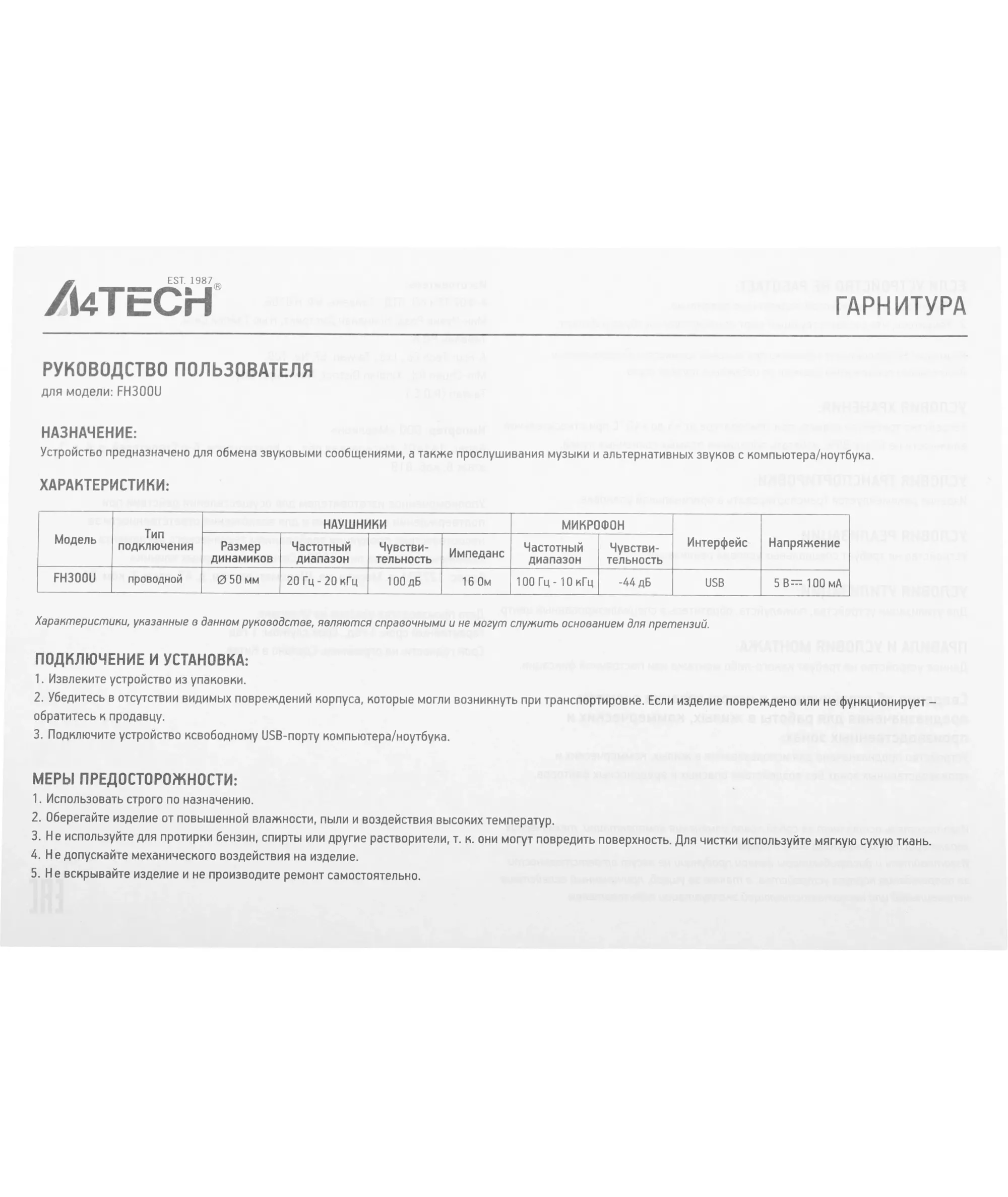 Наушники с микрофоном A4-Tech FH300U BLACK черный 2м мониторные USB оголовье