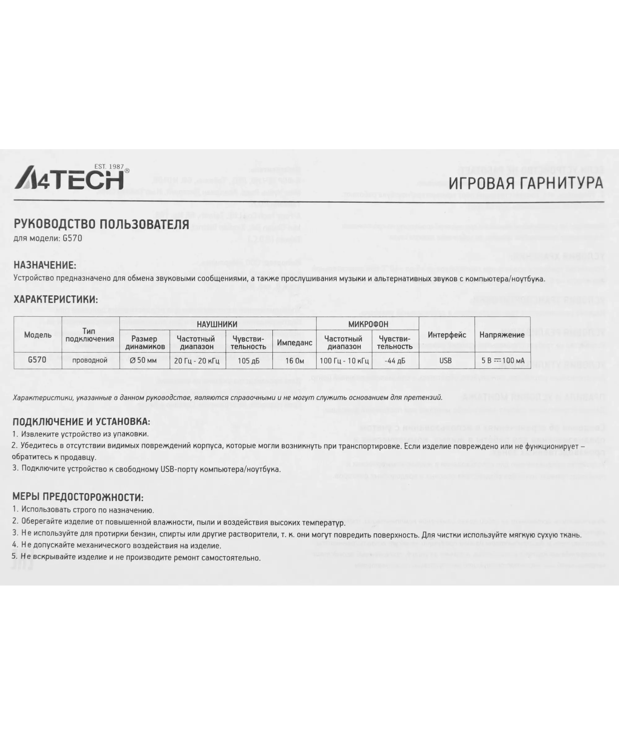 | Коннектор (гарнитура) | USB |