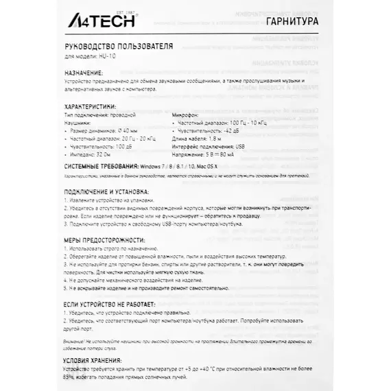 Наличие товара A4-Tech HU-10 BLACK+WHITE