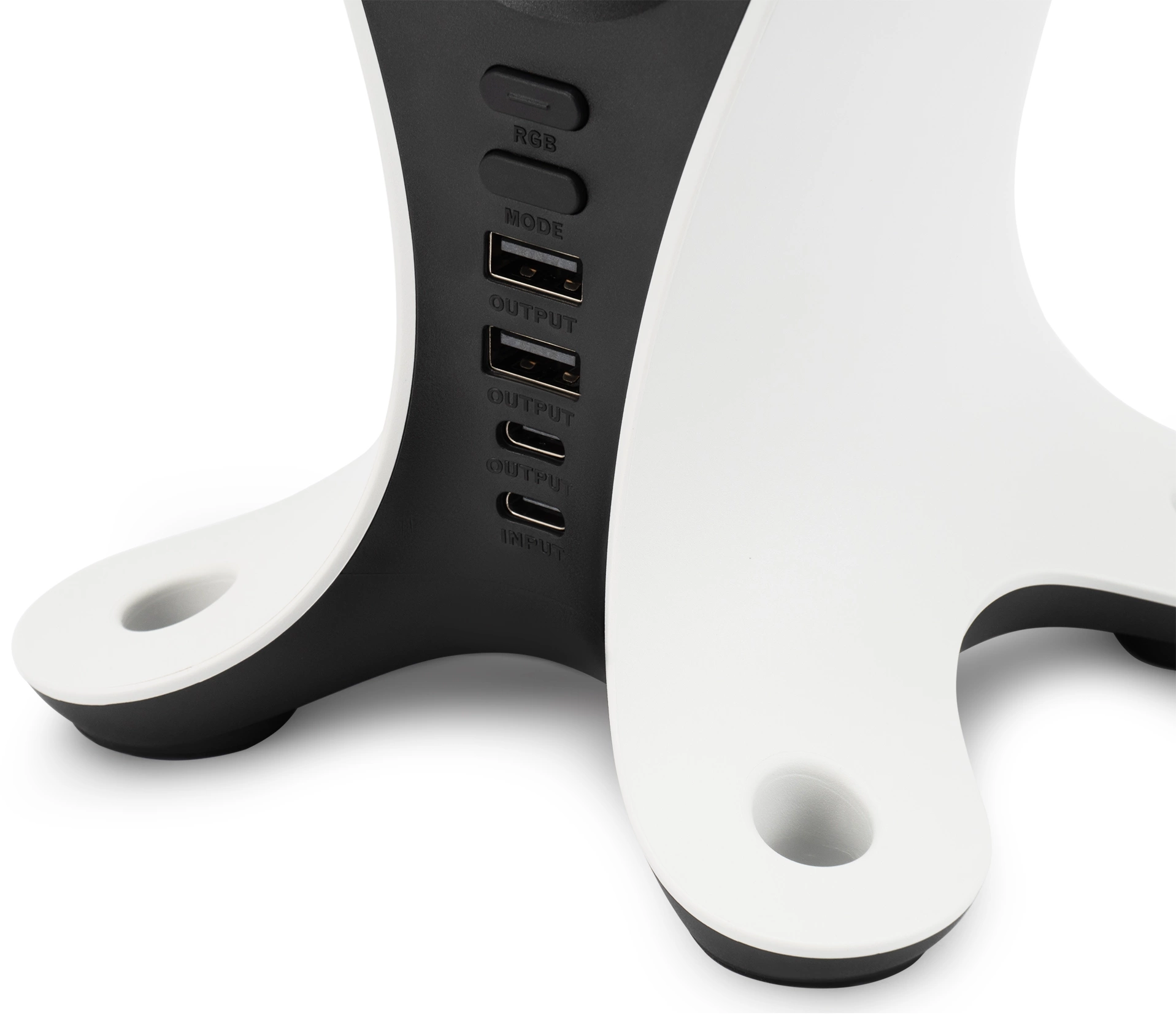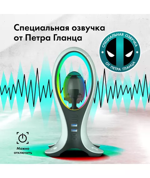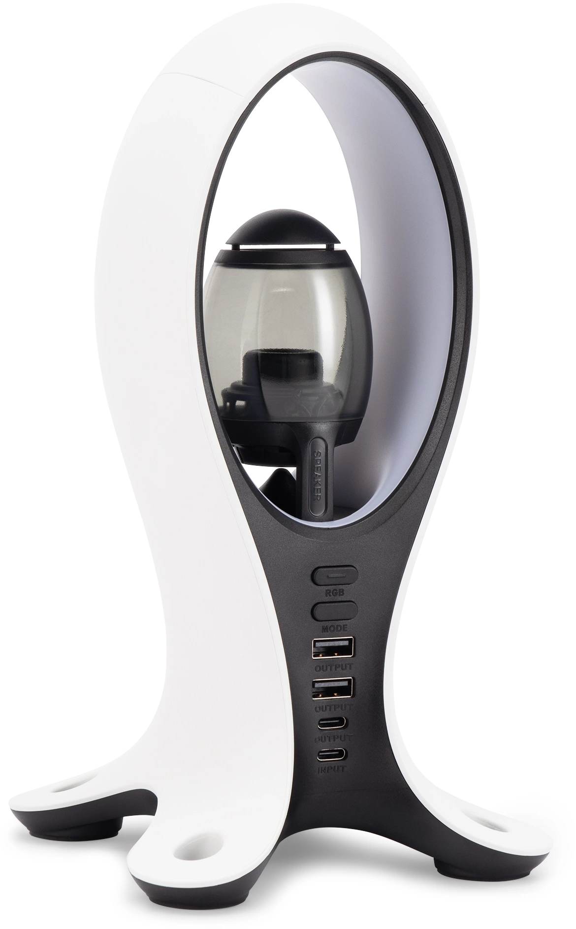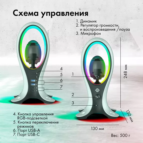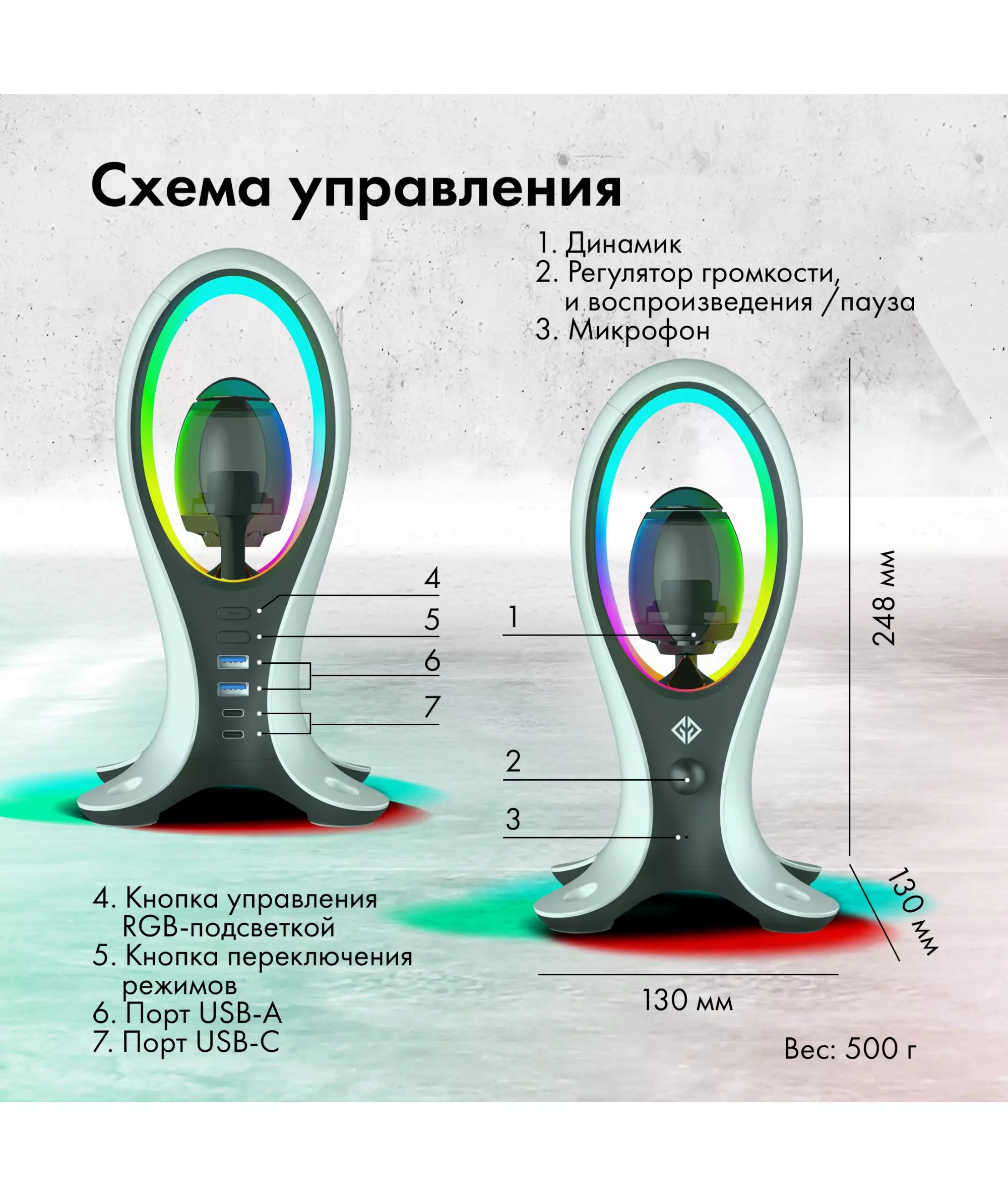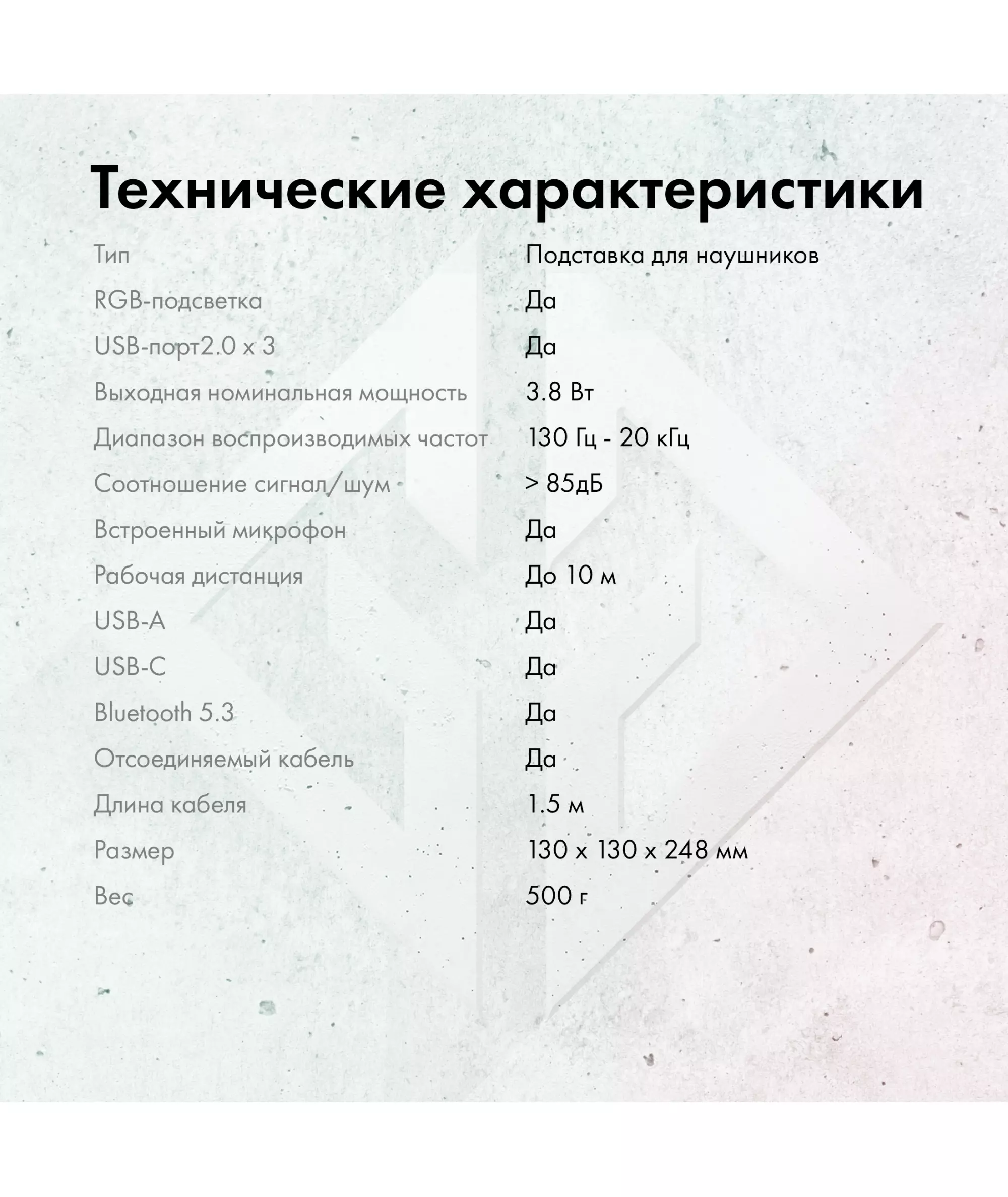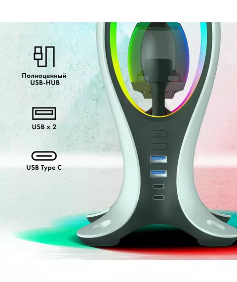 Подставка для гарнитуры с динамической RGB подсветкой, встроенным динамиком для воспроизведения аудио, с поддержкой режима HUB'а. Поддержка BlueTooth.