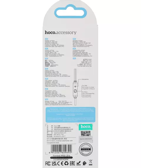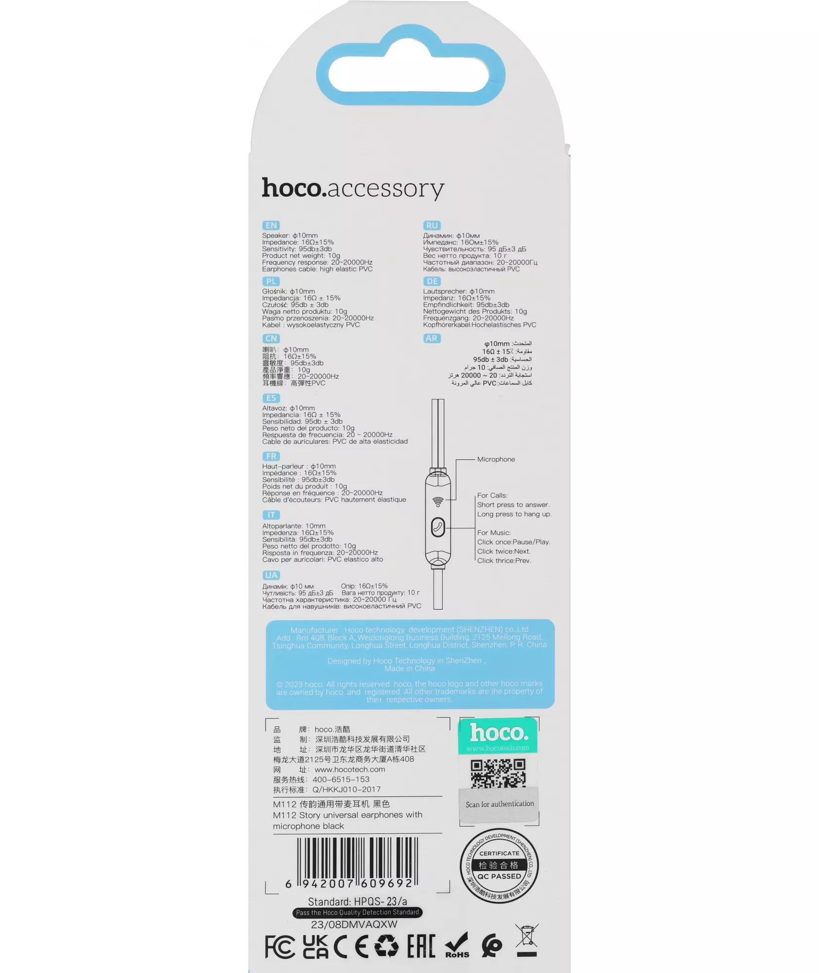 Гарнитура Hoco M112 внутриканальные 1.2м черный проводные в ушной раковине