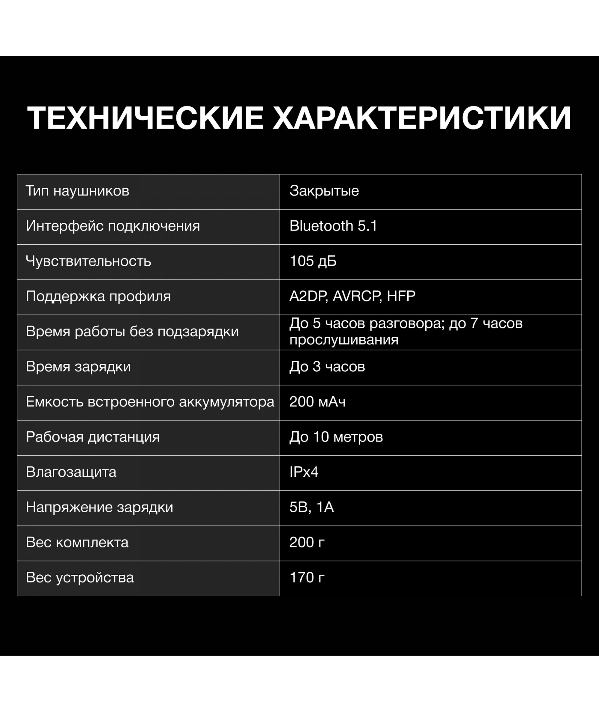 | Емкость аккумулятора наушников | 200 мAч |