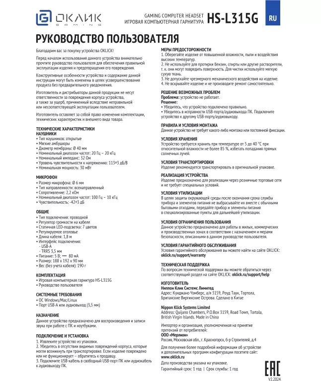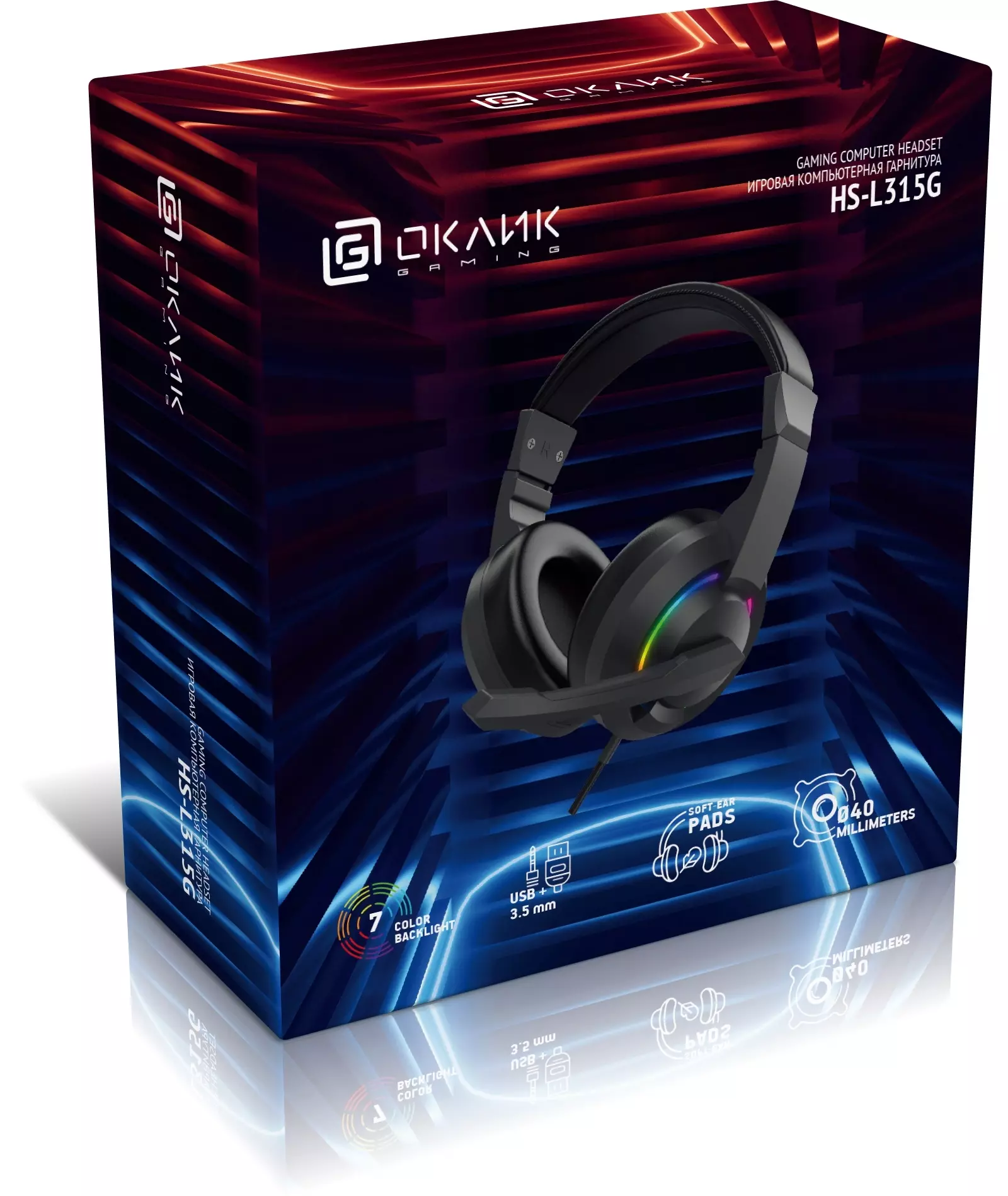 Наушники с микрофоном Oklick HS-L315G черный 1.8м накладные USB оголовье [2007552]