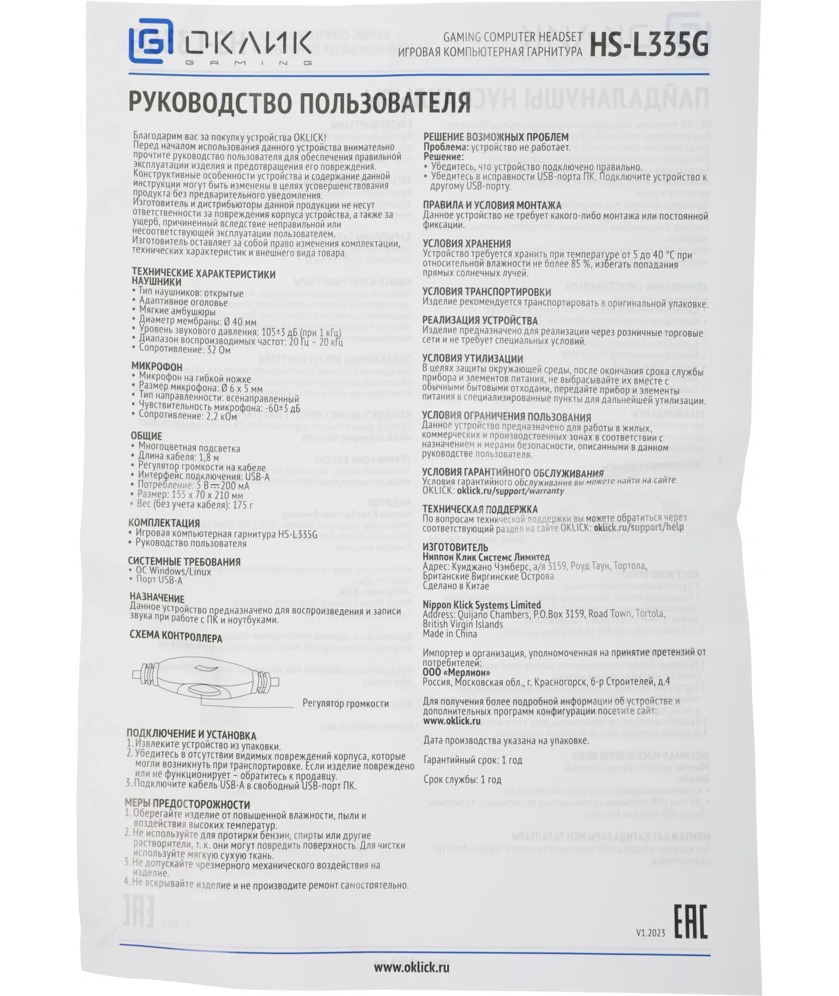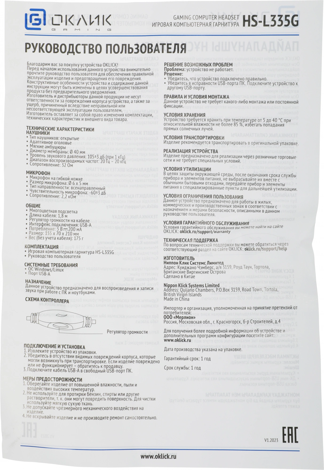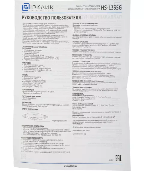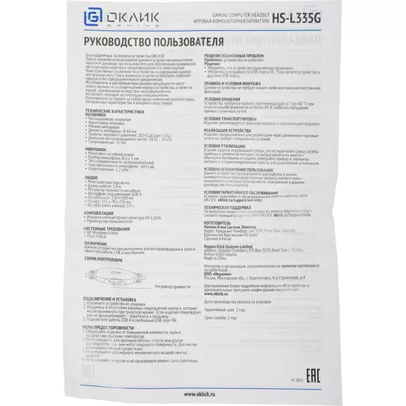 Описание Oklick HS-L335G [1972582]