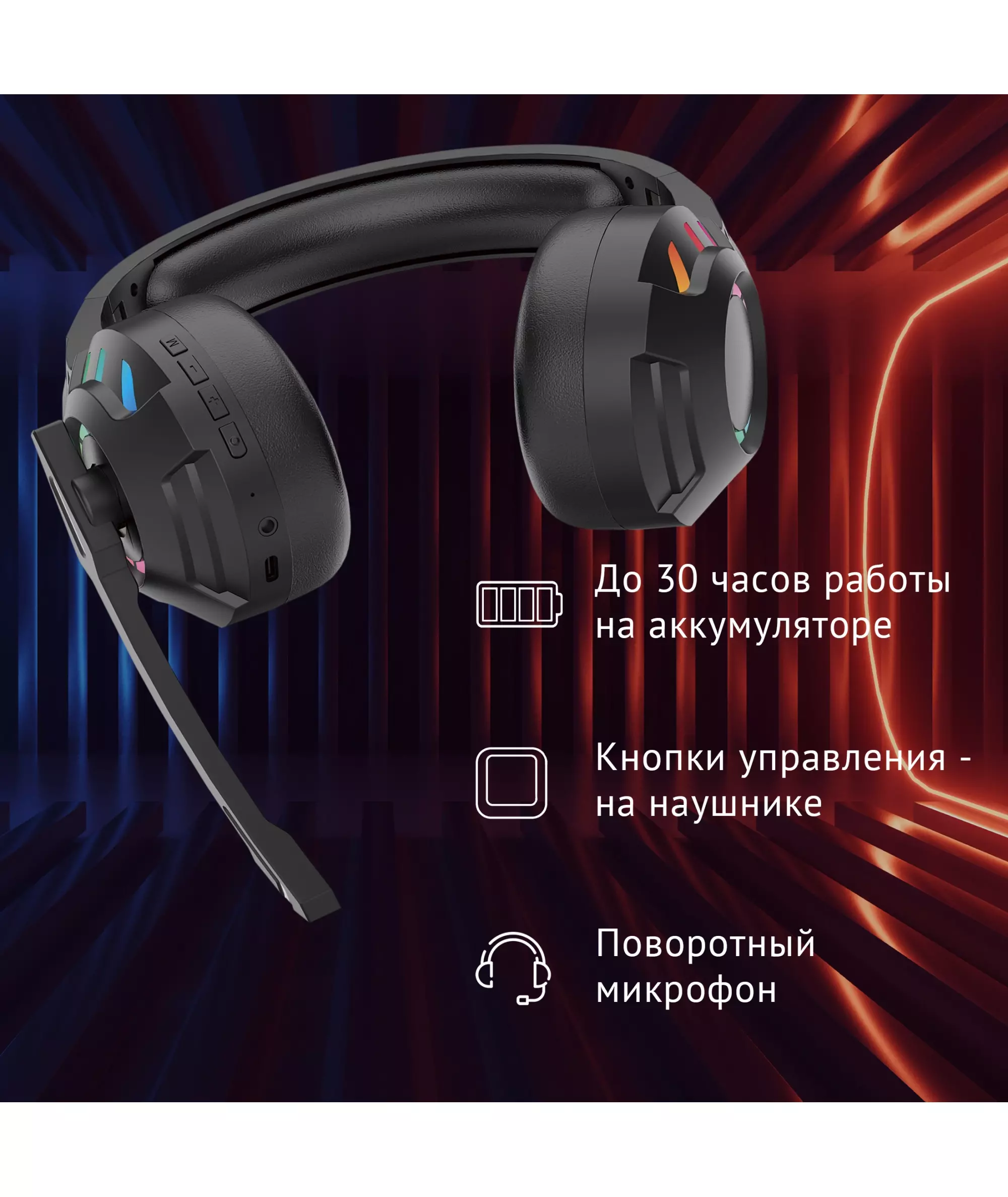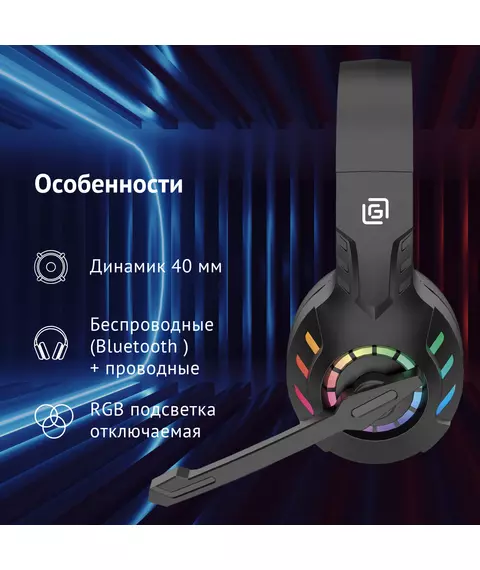| Особенности | Игровая гарнитура с проводным и беспроводным режимами работы. До 30 часов работы в беспроводном режиме. Отключаемая RGB подсветка, поворотный микрофон. Складные. Возможность работы по проводному подключению. Работает с приставками. Поддерживает подключение по Bluetooth 5.3. Для игр, музыки, общения. |