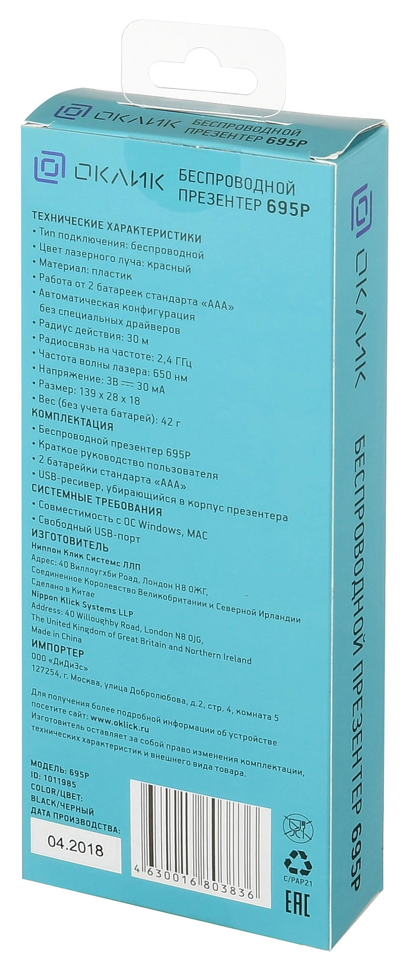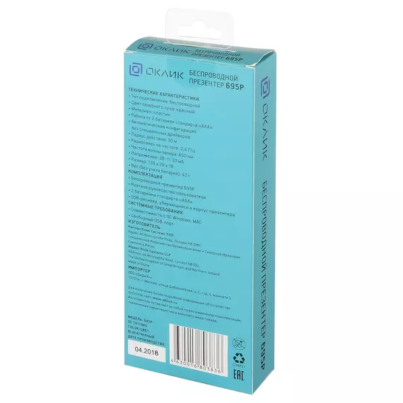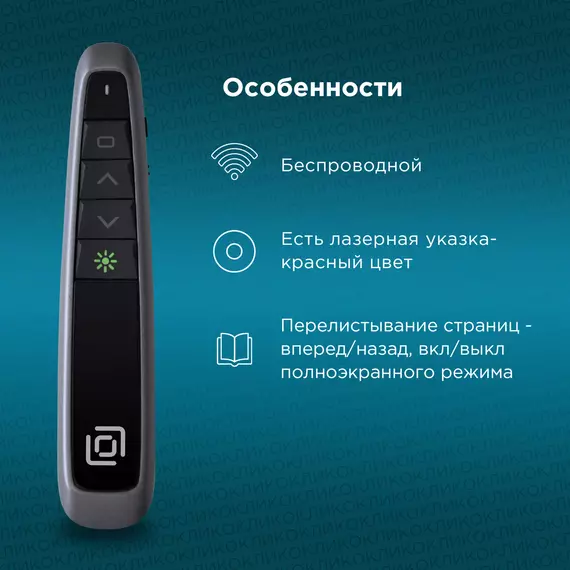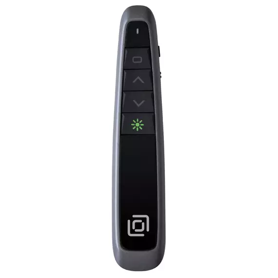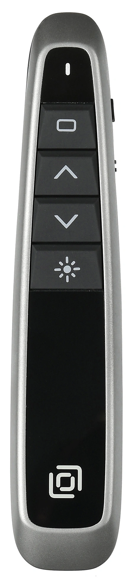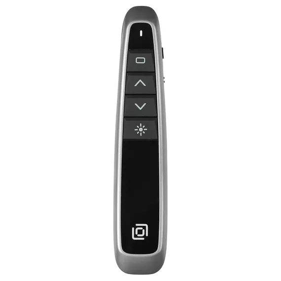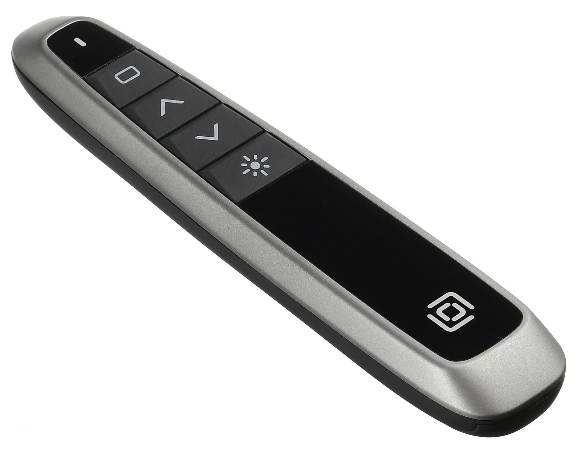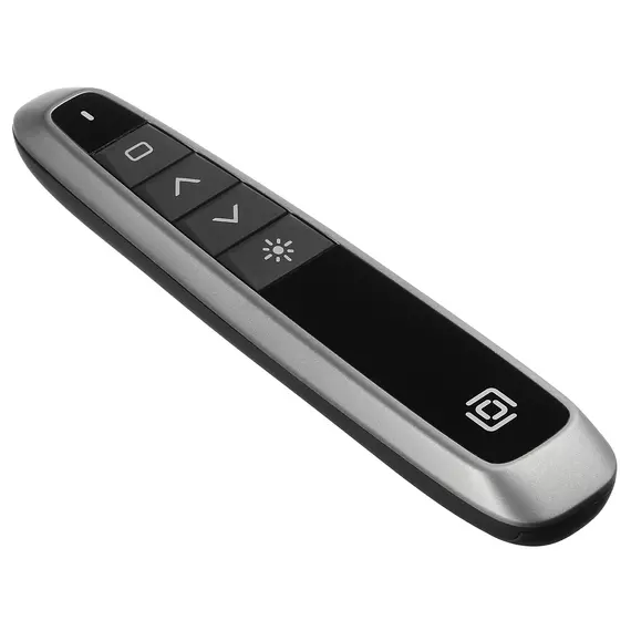 Предназначен для управления показаом слайдов. Радиосвязщсь на частоте 2,4 ГГц. Частота волны лазера 650 нм. Имеется компактны USB-ресивер, убирющийся в корпус. СОвместимость с ОС Windows и MAC. Свободный USB порт.