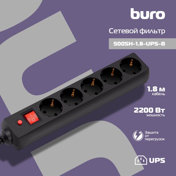 Сетевой фильтр для ИБП BURO 500SH-1.8-UPS-B 1.8м (5 розеток) черный