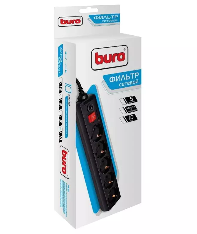 Сетевой фильтр BURO 500SH-10-B 10м (5 розеток) черный (коробка)
