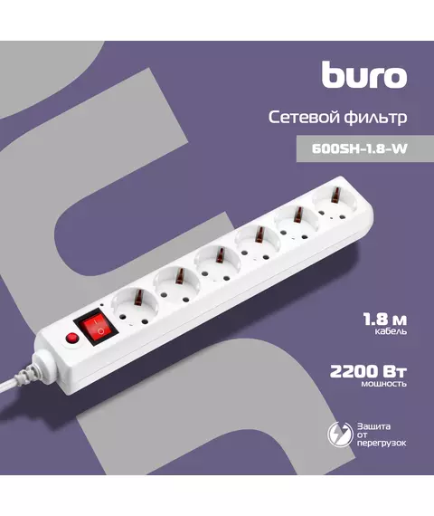 Сетевой фильтр BURO 600SH-1.8-W 1.8м (6 розеток) белый (коробка)