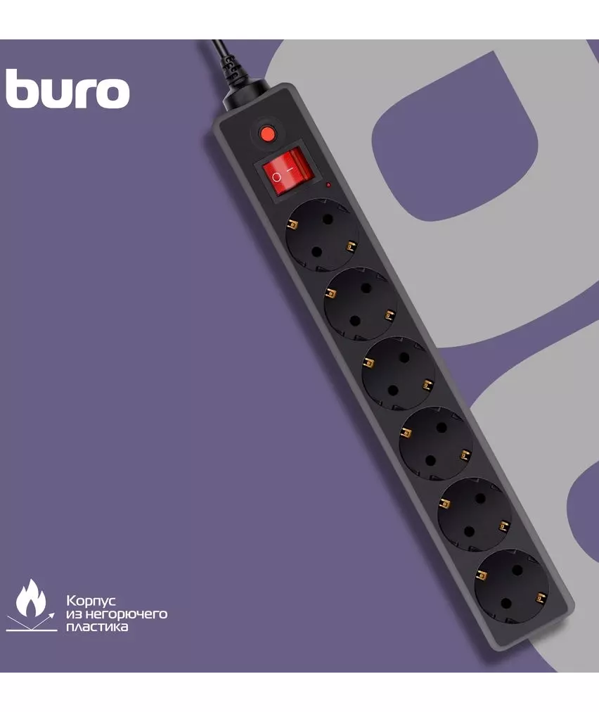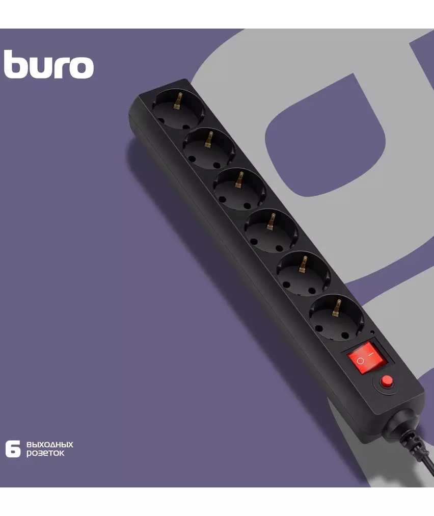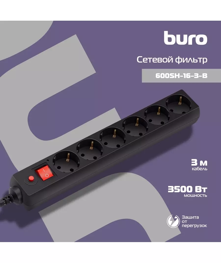 Фильтр сетевой BURO 600SH-16-3-B 3м, 6 розеток, черный