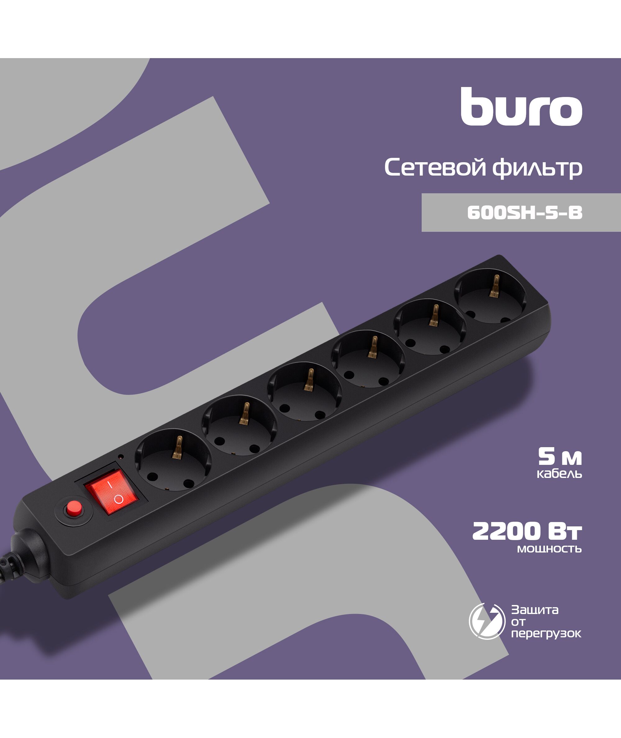 Сетевой фильтр BURO 600SH-5-B 5м (6 розеток) черный (коробка)