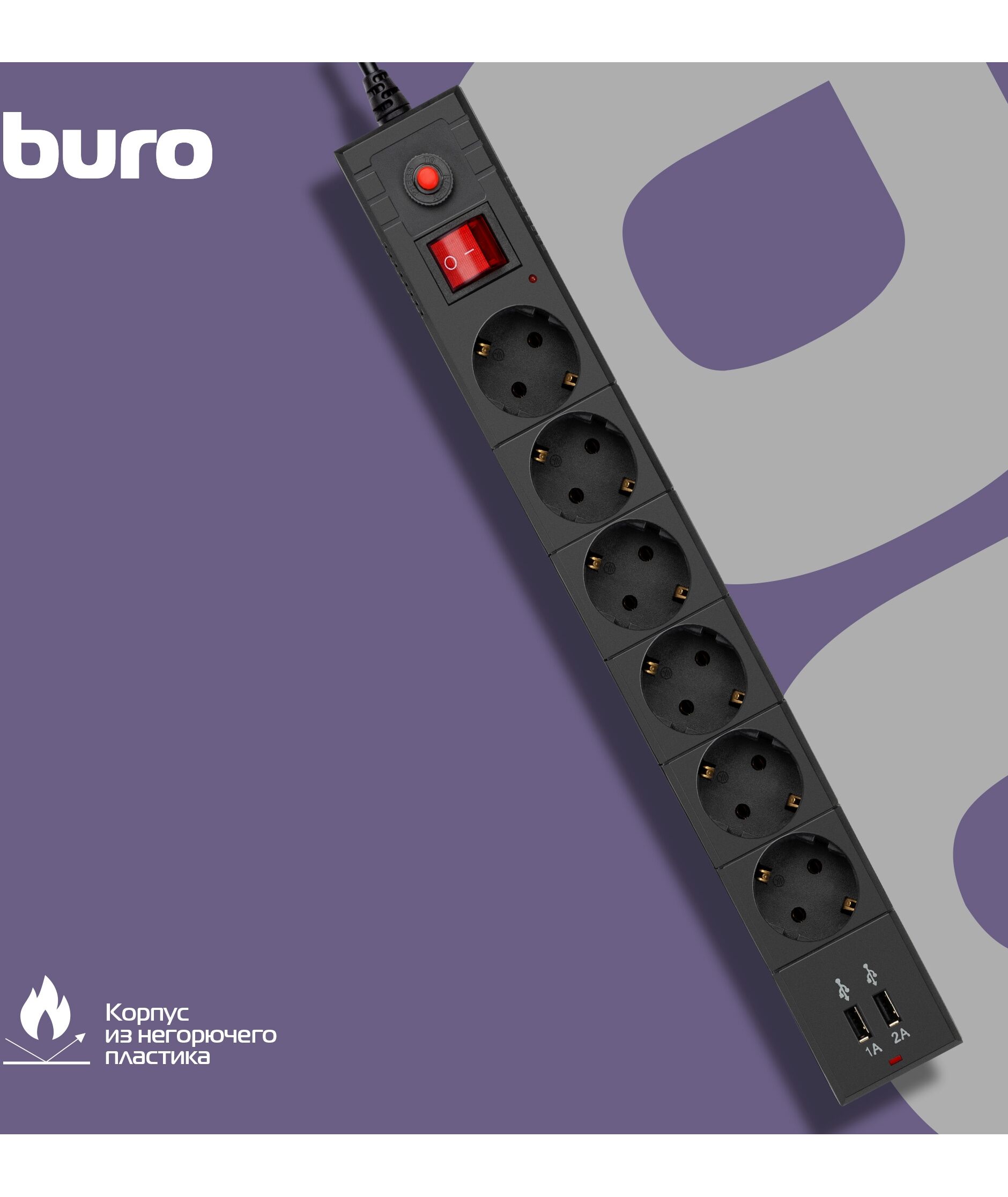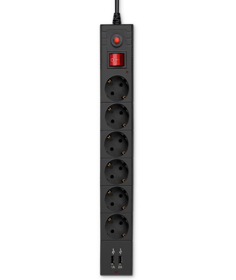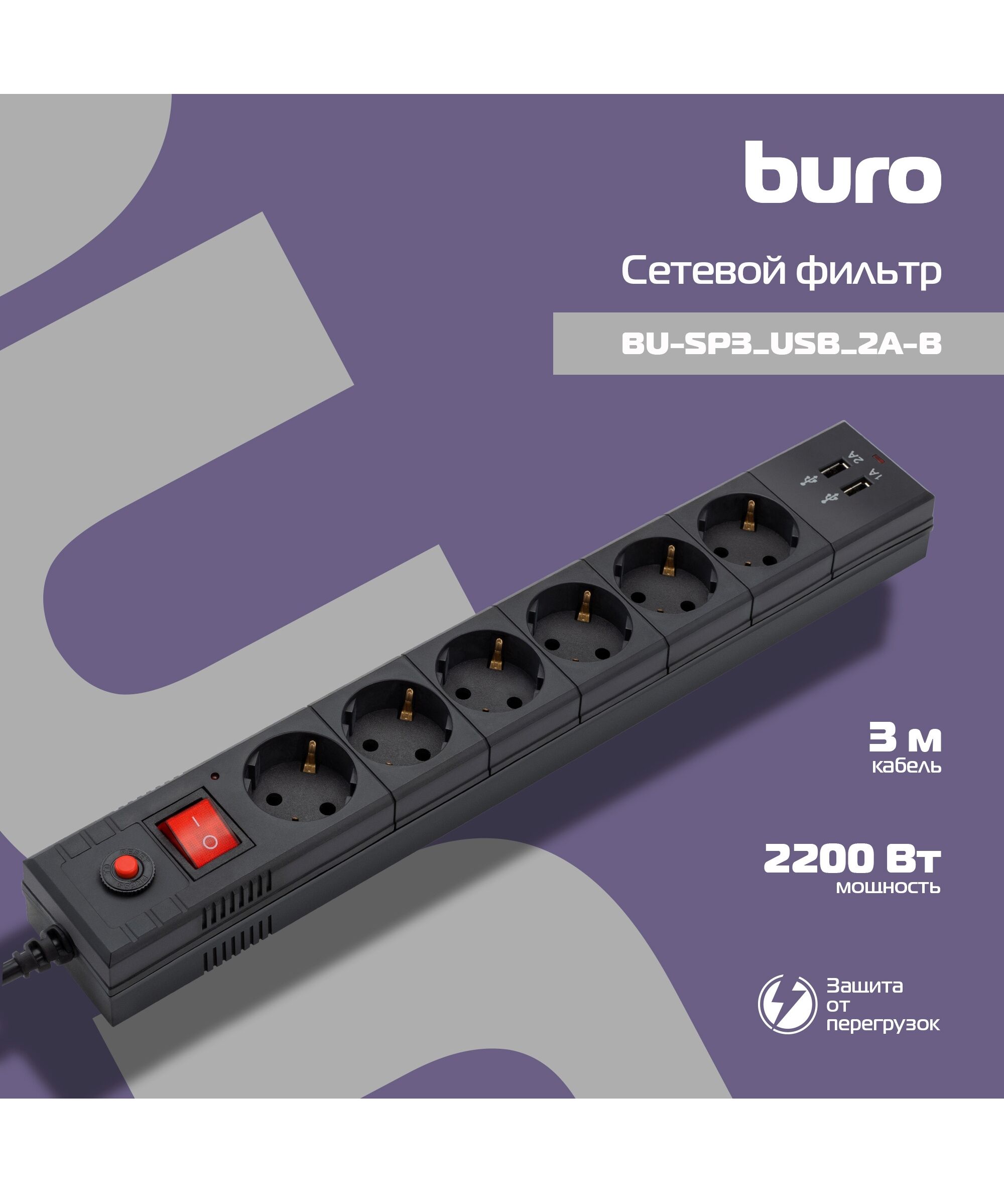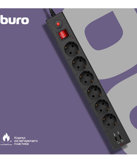 Сетевой фильтр BURO BU-SP3_USB_2A-B 3м (6 розеток) черный (коробка)