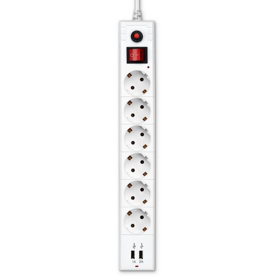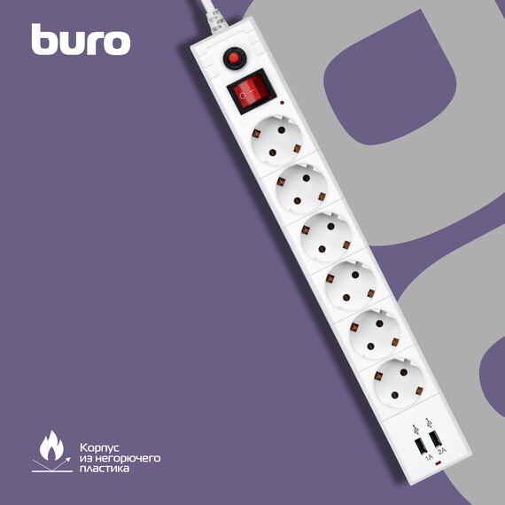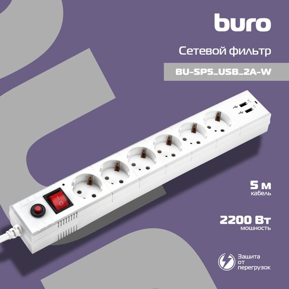 Сетевой фильтр BURO BU-SP5_USB_2A-W 5м (6 розеток) белый (коробка)