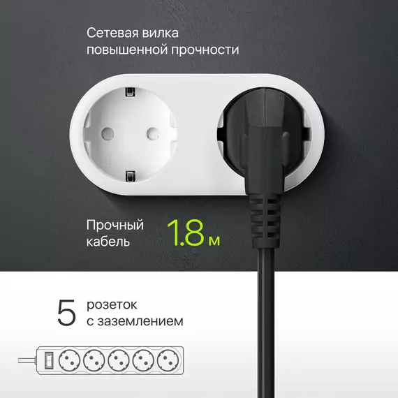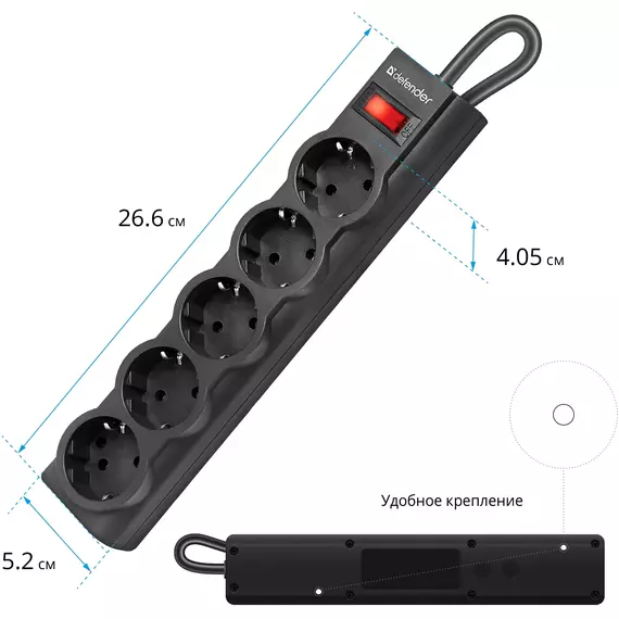 | Особенности | Автоматический предохранитель, встроенный в выключатель. Защита от перегрузки и короткого замыкания. Защита от импульсных помех. Индикатор сети. Крепление на стену. Корпус из негорючего пластика. |