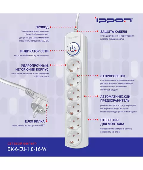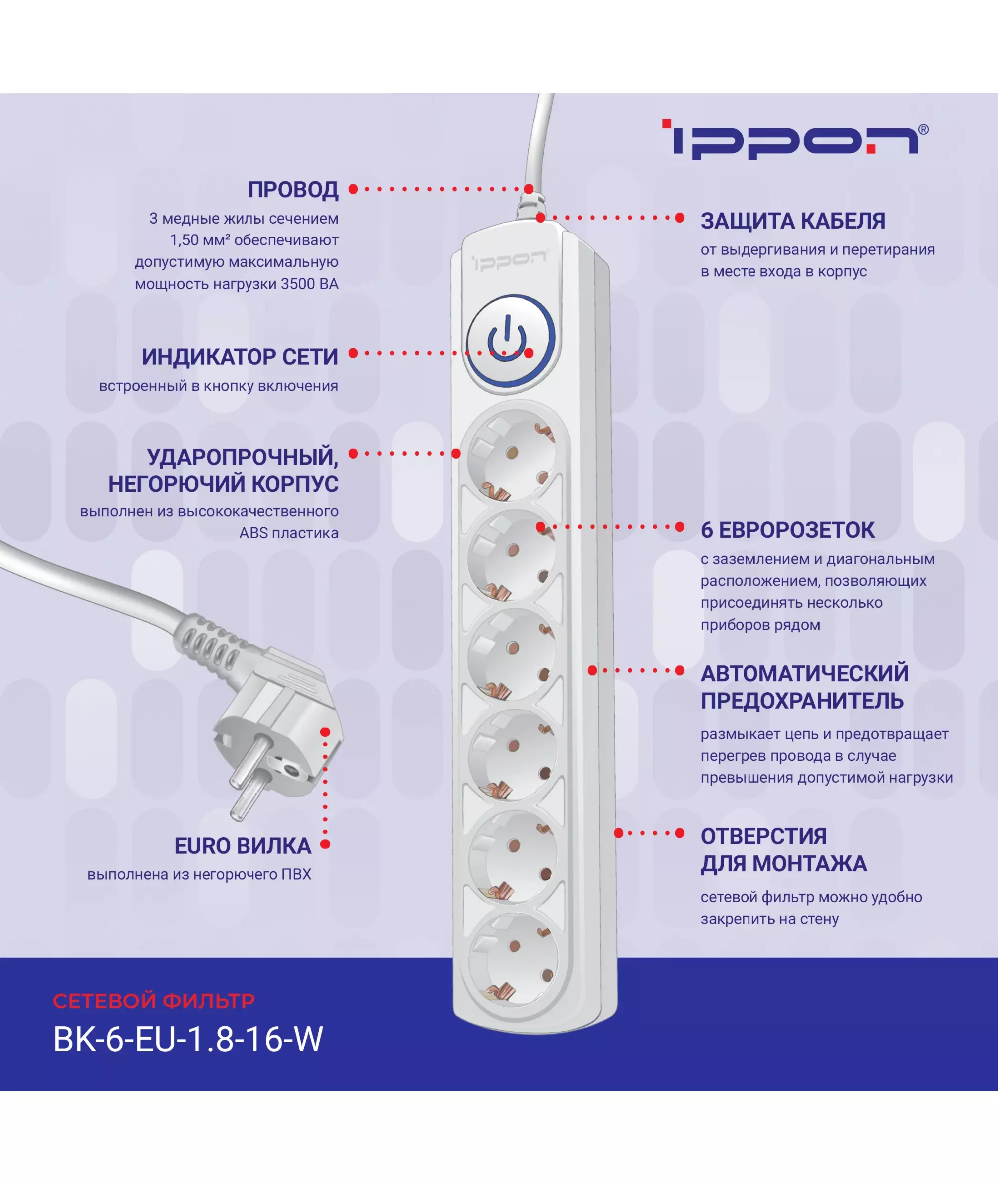 Сетевой фильтр Ippon BK-6-EU-1.8-16-W 1.8м (6 розеток) белый (коробка)