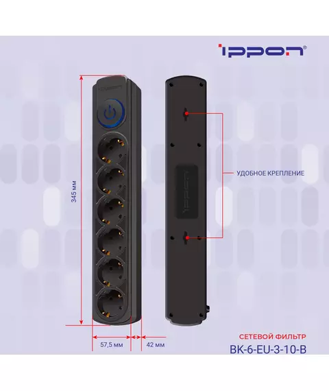 Сетевой фильтр Ippon BK-6-EU-3-10-B 3м (6 розеток) черный (коробка)