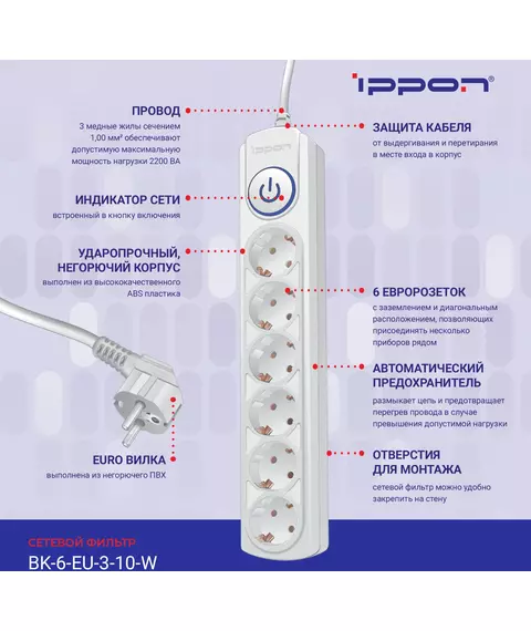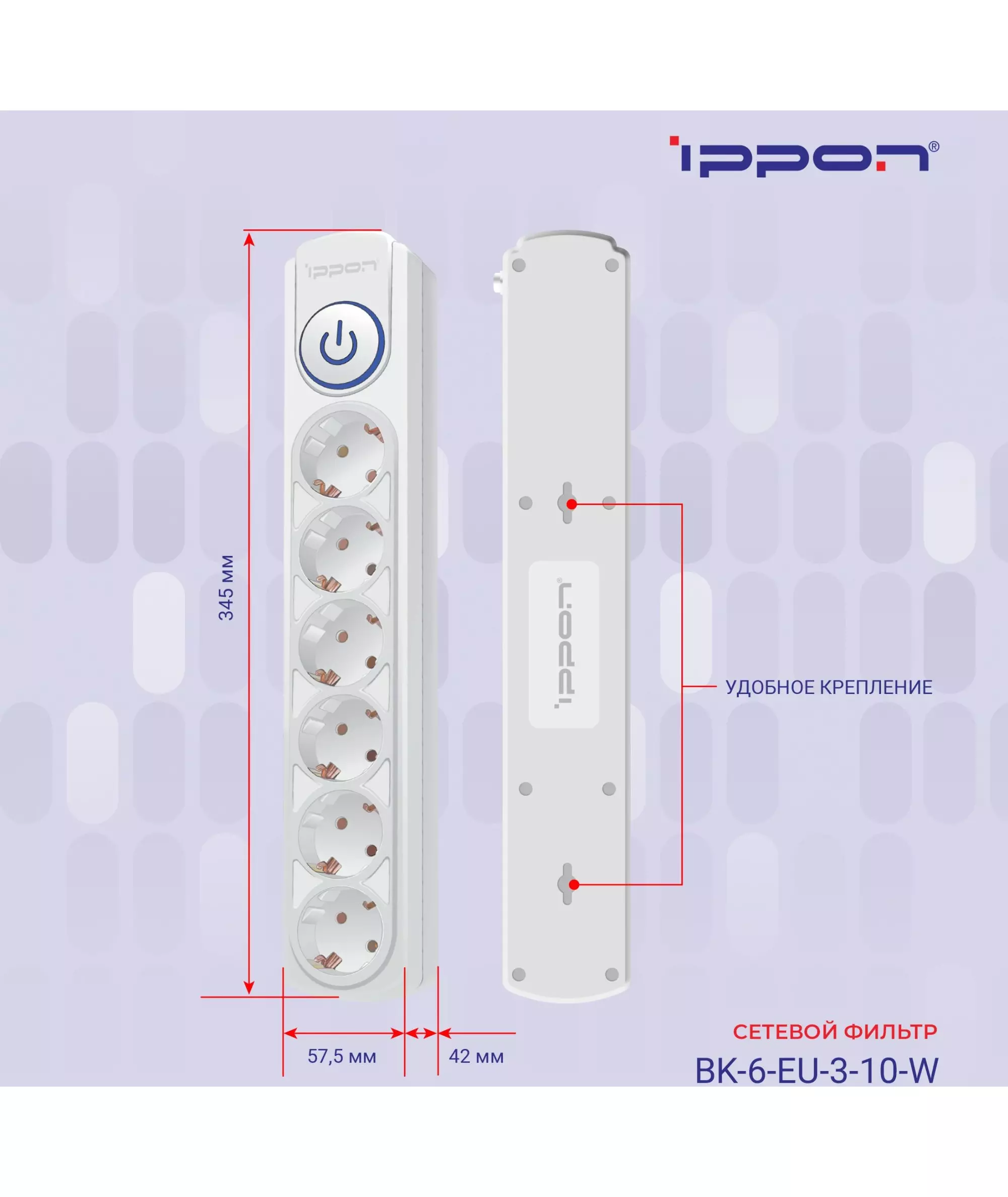 Сетевой фильтр Ippon BK-6-EU-3-10-W 3м (6 розеток) белый (коробка)