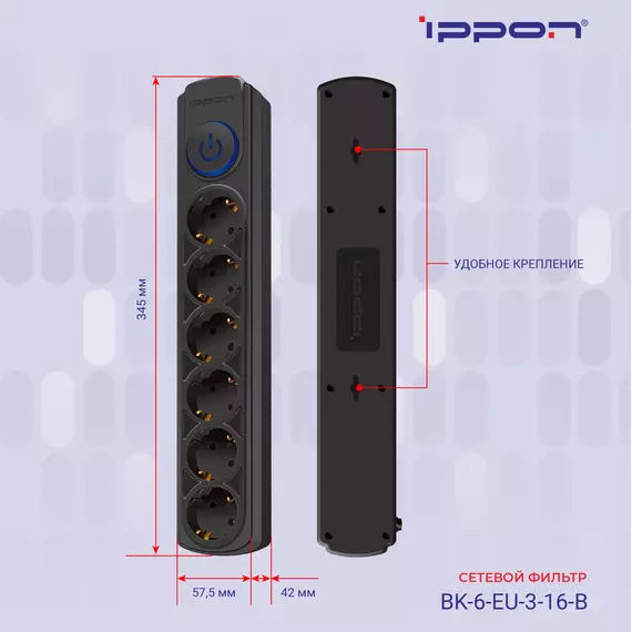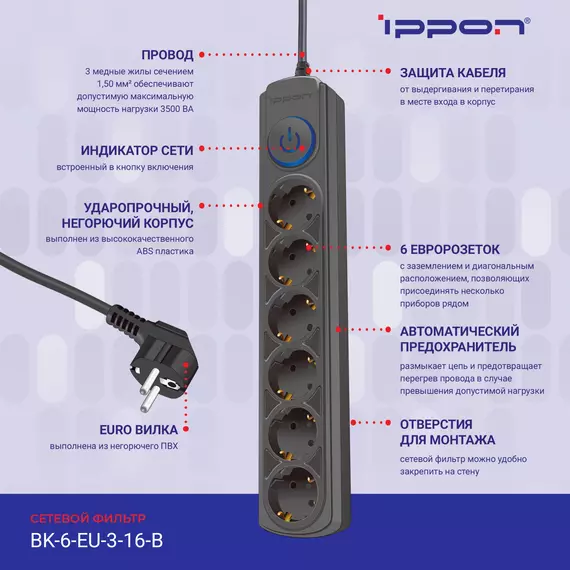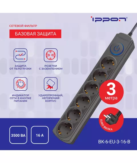 Сетевой фильтр Ippon BK-6-EU-3-16-B 3м (6 розеток) черный (коробка)
