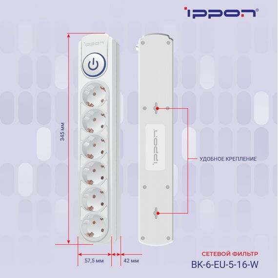 Сетевой фильтр Ippon BK-6-EU-3-16-W 3м (6 розеток) белый (коробка)