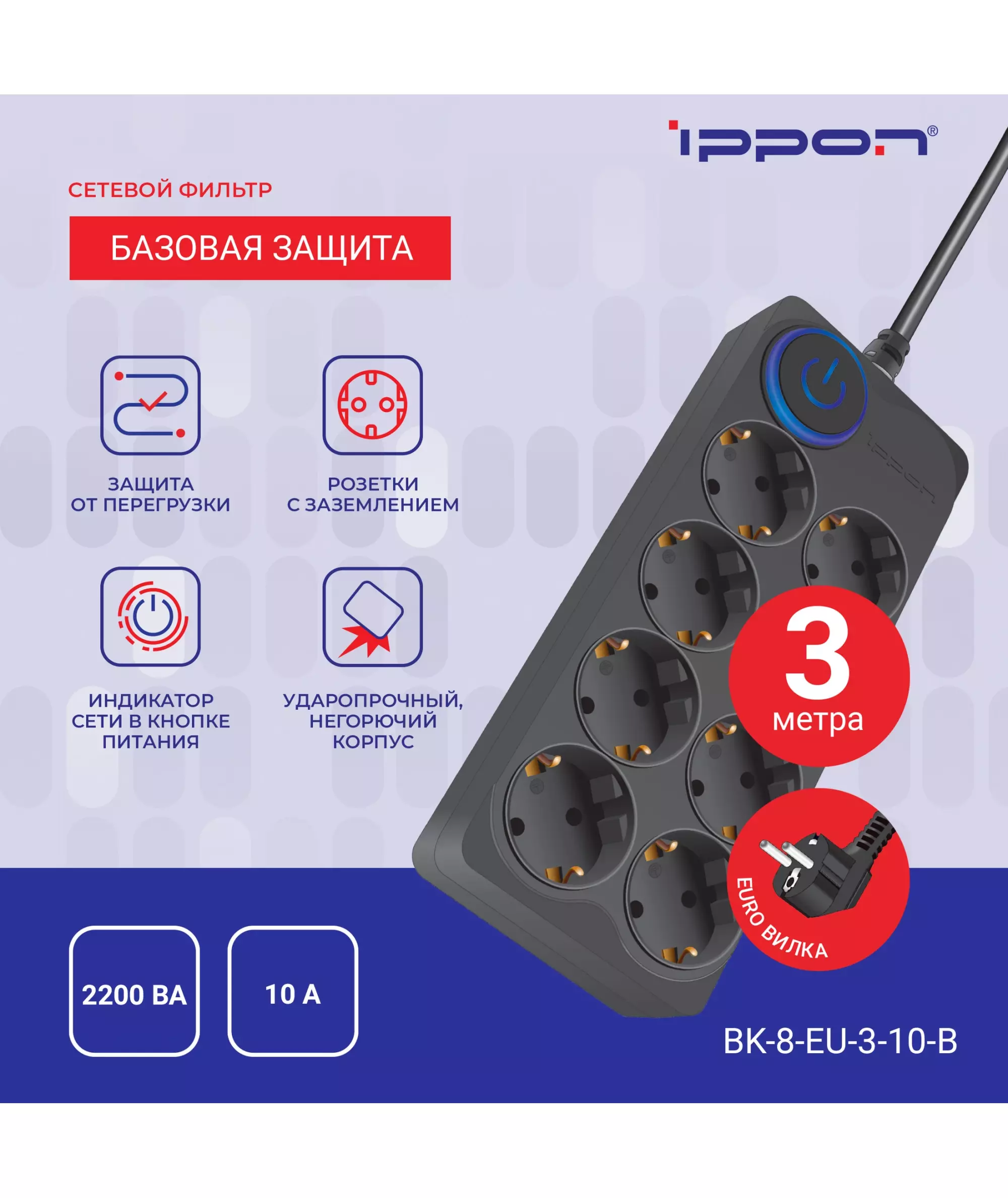Сетевой фильтр Ippon BK-8-EU-3-10-B 3м (8 розеток) черный (коробка)