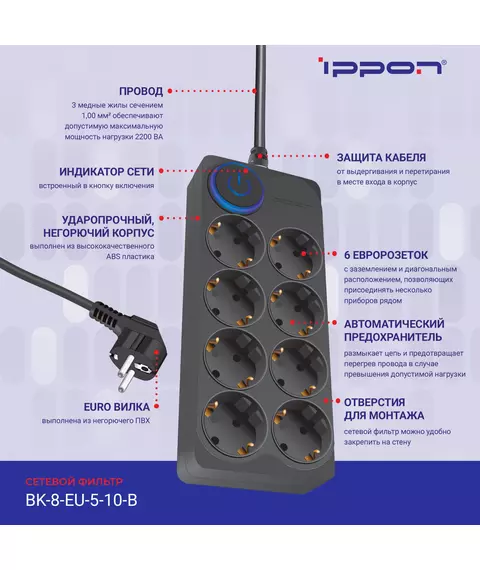 Сетевой фильтр Ippon BK-8-EU-5-10-B 5м (8 розеток) черный (коробка)