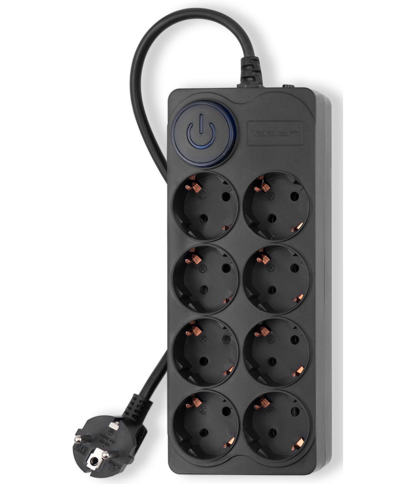 | Особенности | 8 евророзеток с заземлением. Входная вилка Schuko. Защита от перегрузки. Защита от импульсов высокого напряжения. Защита от перетирания провода в месте входа в корпус фильтра. Ударопрочный негорючий корпус. Кнопка питания с индикатором сети. |