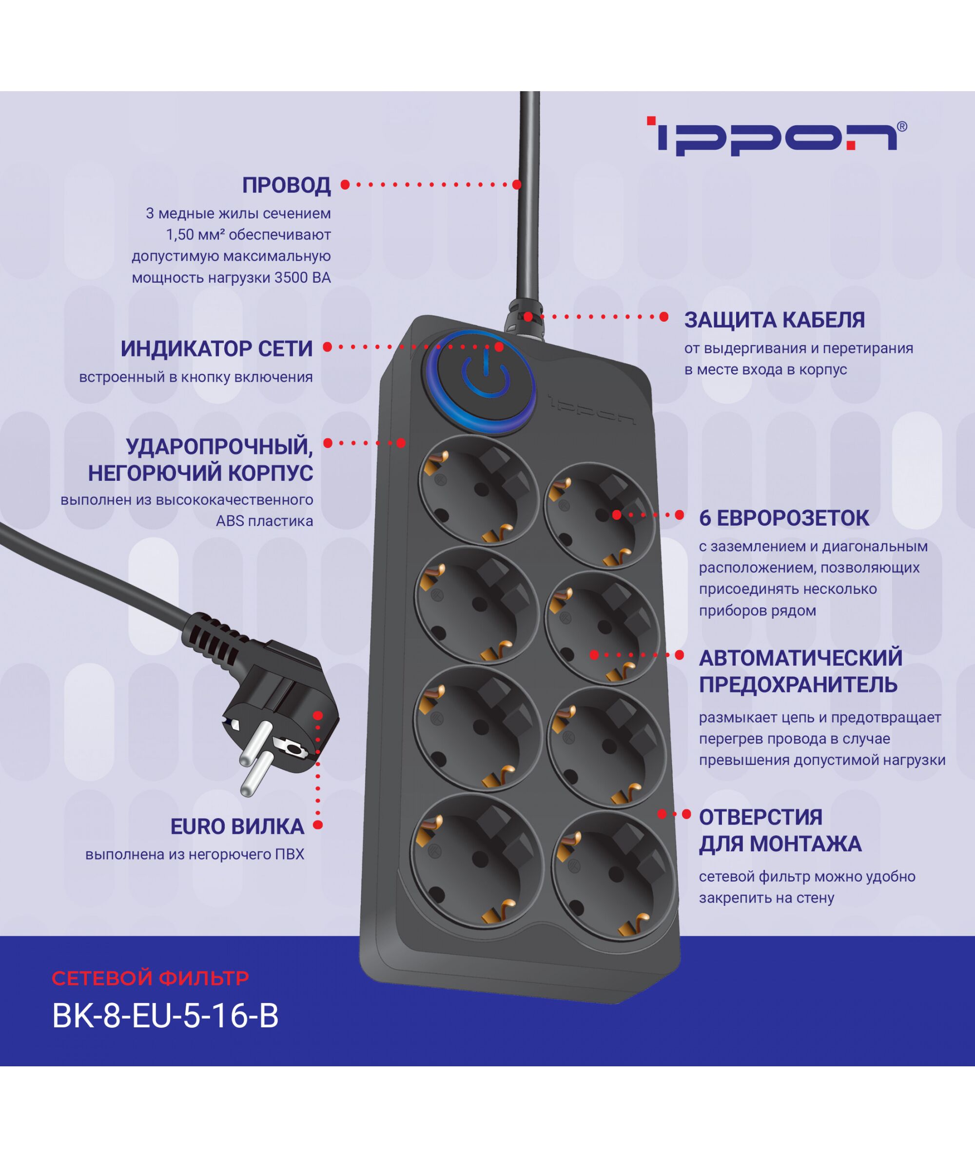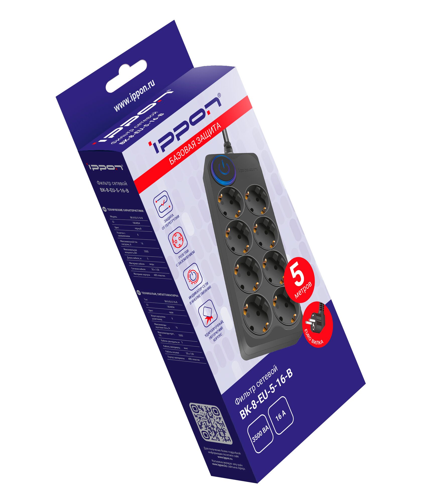 Сетевой фильтр Ippon BK-8-EU-5-16-B 5м (8 розеток) черный (коробка)
