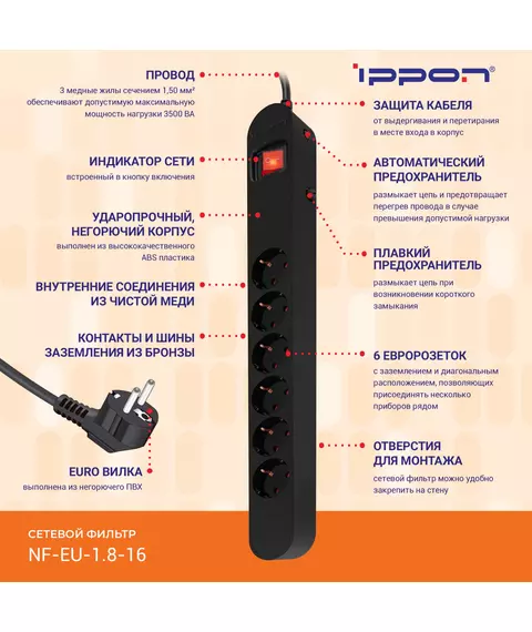 Сетевой фильтр Ippon NF-EU-1.8-16 1.8м (6 розеток) черный (коробка)