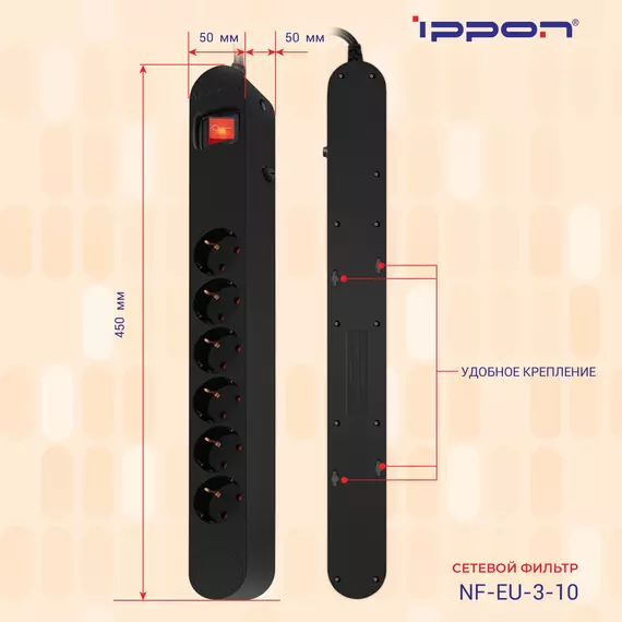 Сетевой фильтр Ippon NF-EU-3-10 3м (6 розеток) черный (коробка)