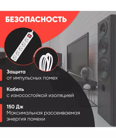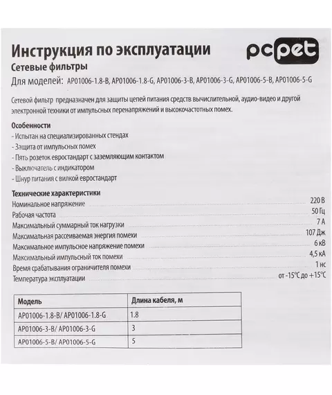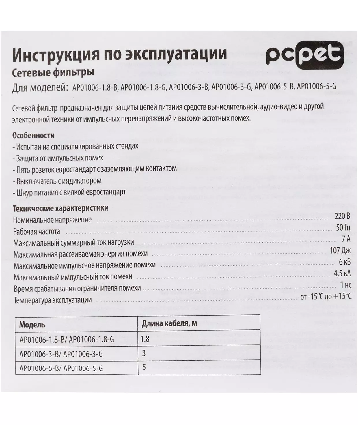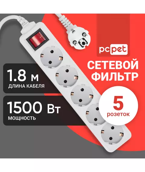 Сетевой фильтр PC Pet AP01006-1.8-G 1.8м (5 розеток) серый (пакет ПЭ)