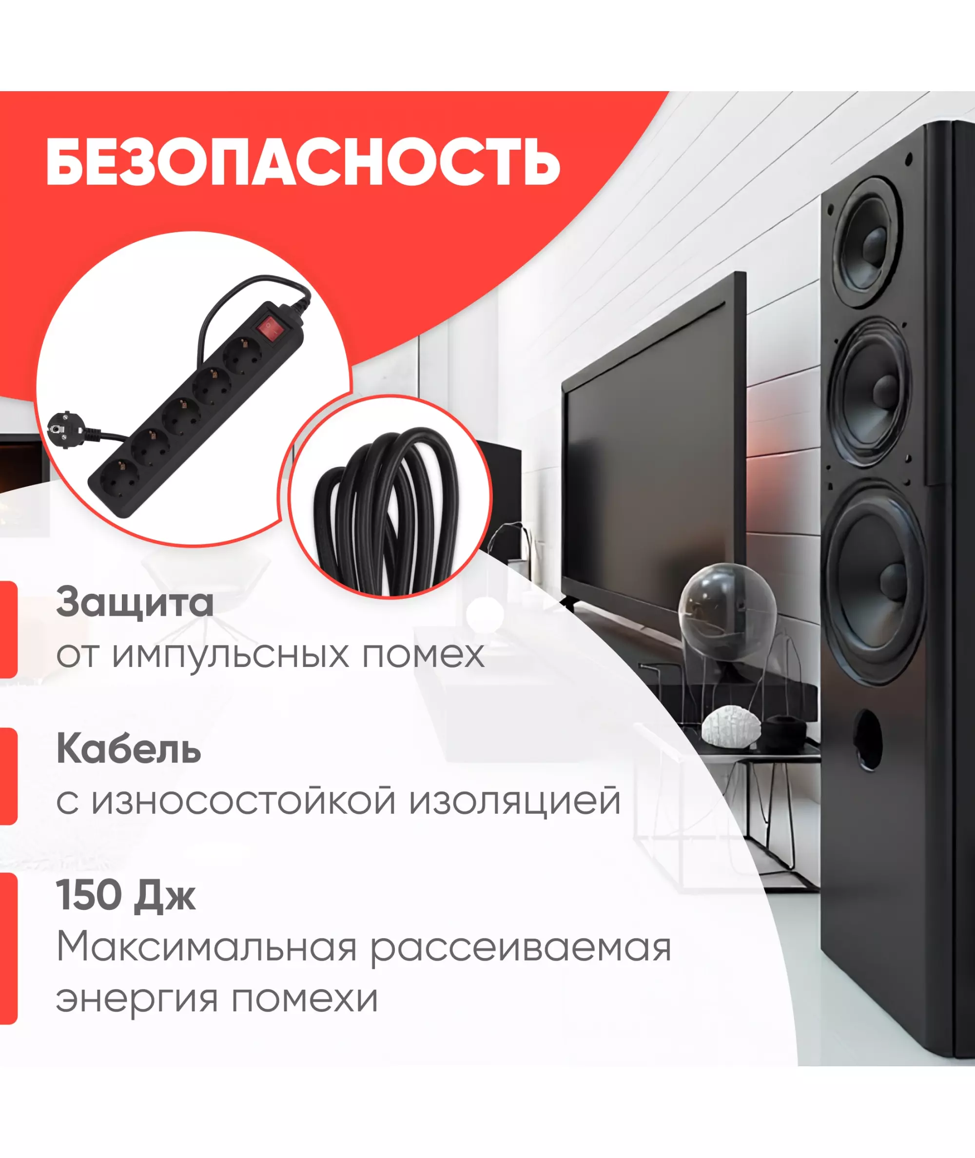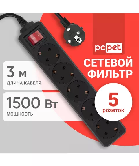 Сетевой фильтр PC Pet AP01006-3-B 3м (5 розеток) черный (пакет ПЭ)