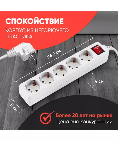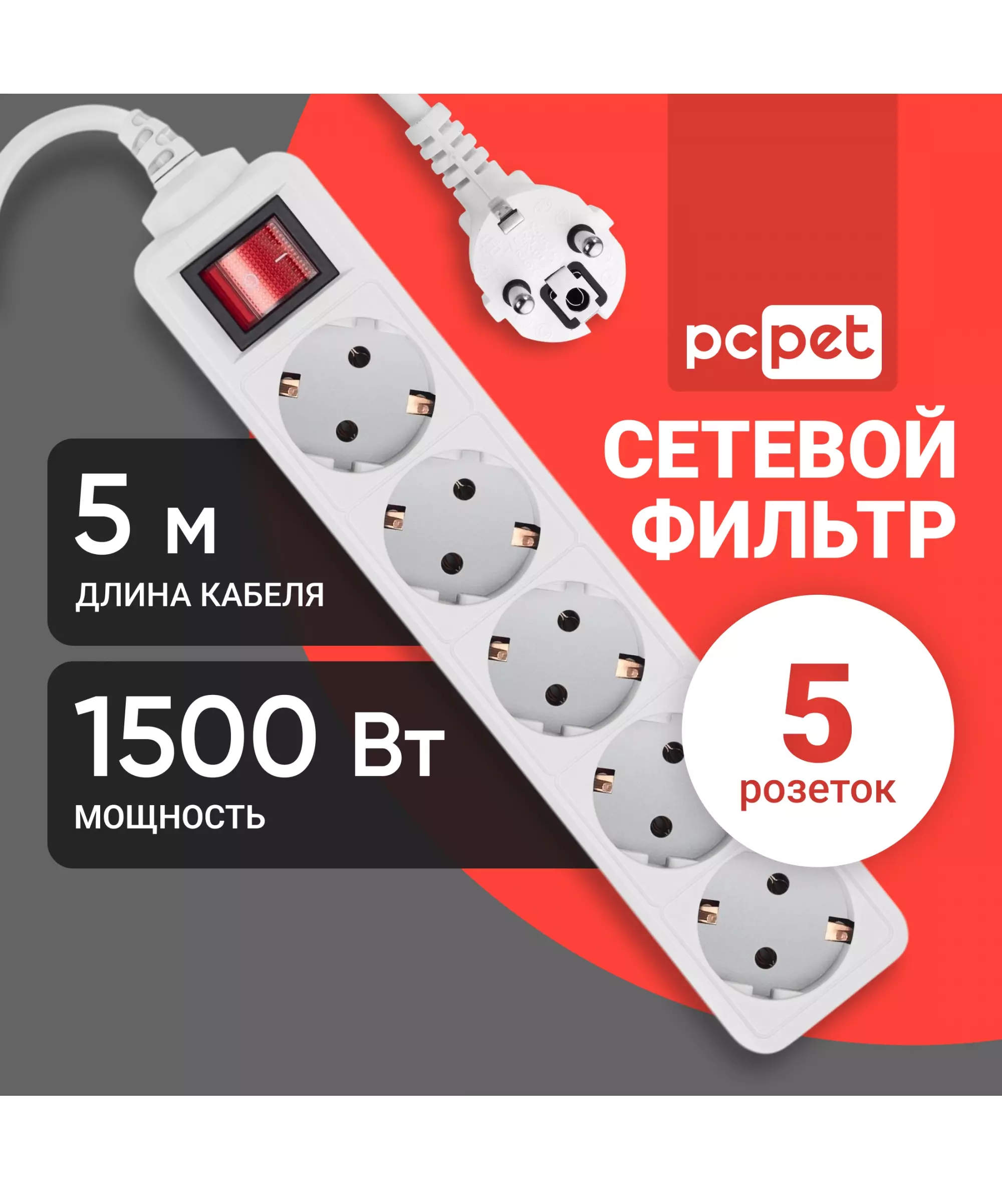 Сетевой фильтр PC Pet AP01006-5-G 5м (5 розеток) серый (пакет ПЭ)
