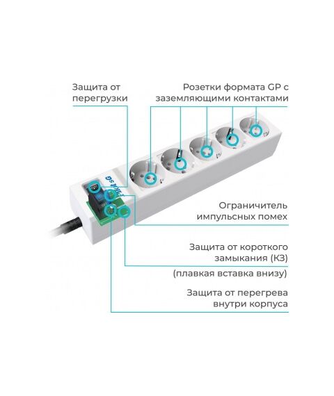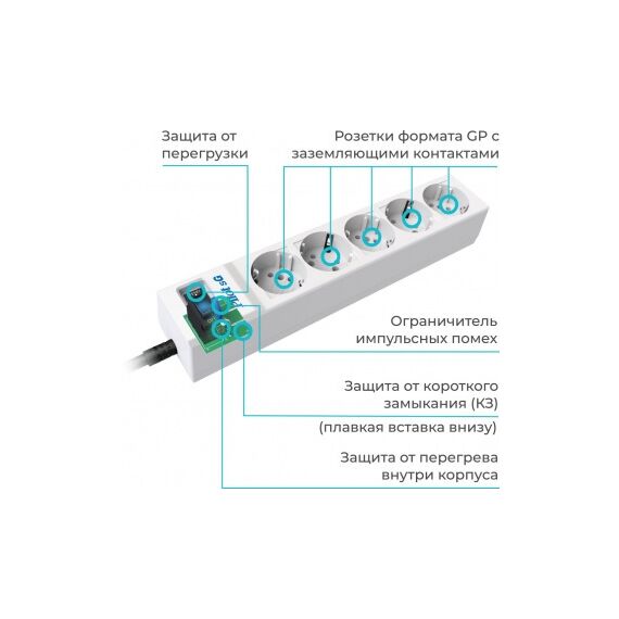 | Особенности | Розетка стандарта GP - оригинальной конструкции, которая позволяет подключить к 5 выходным розеткам до 10 утройств одновременно. |
