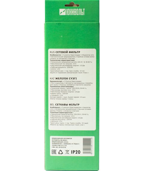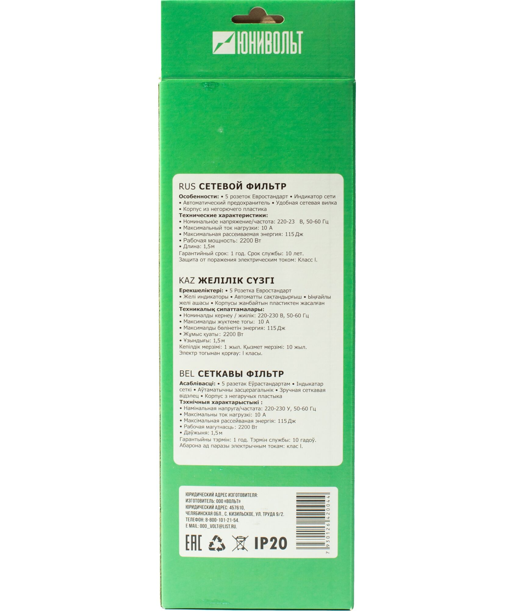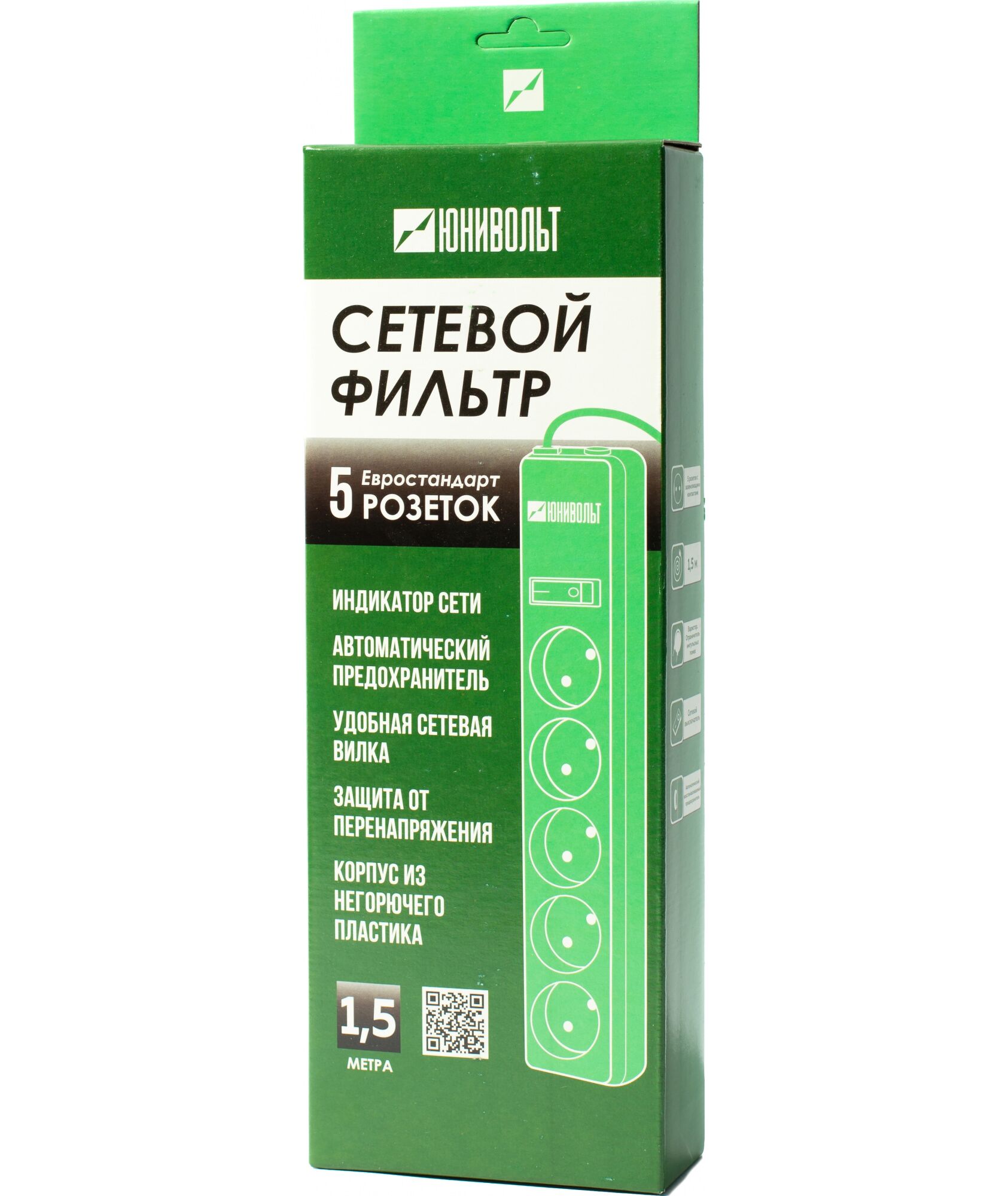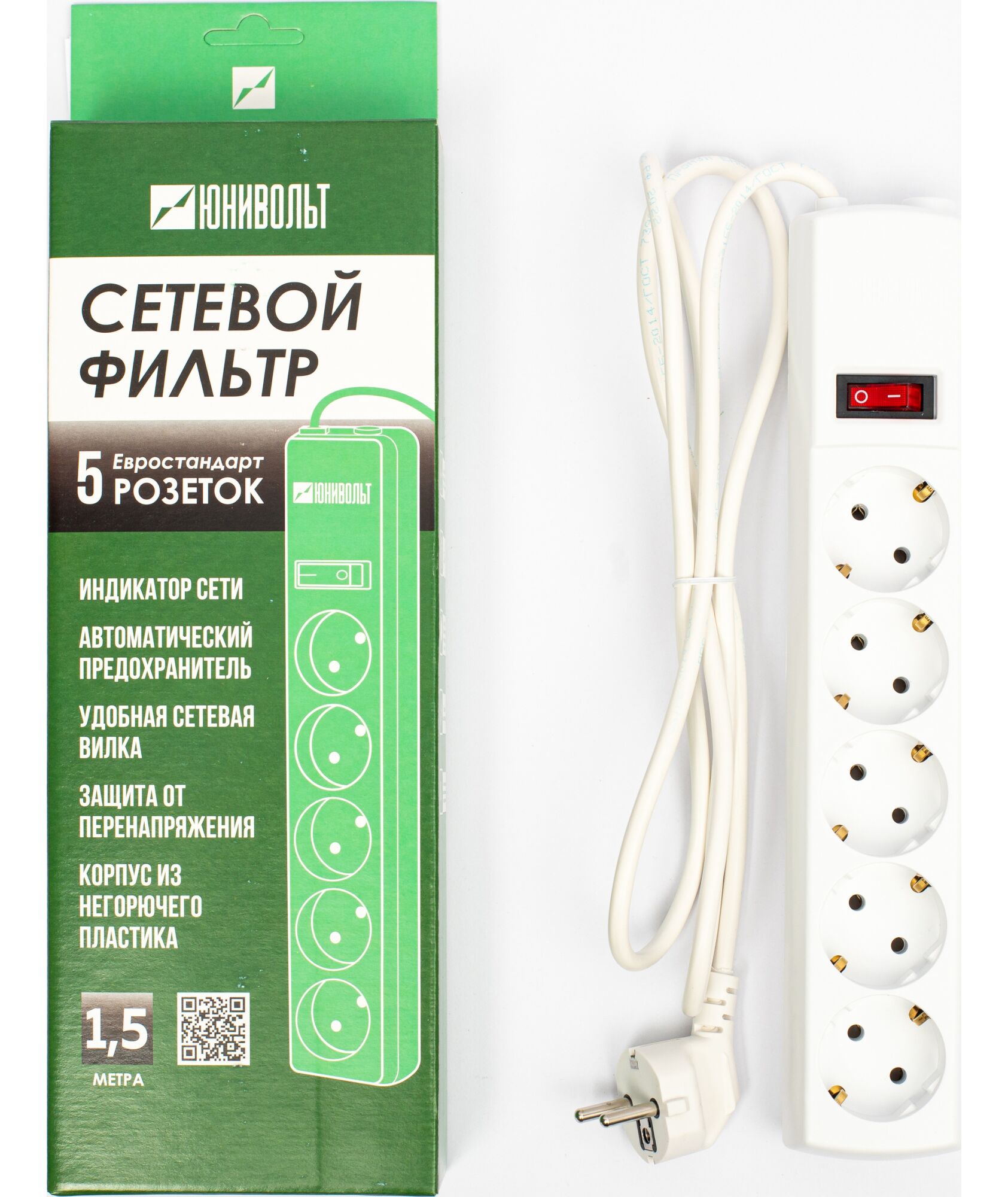Сетевой фильтр Юнивольт 00-00000389 1.5м (5 розеток) белый (коробка)