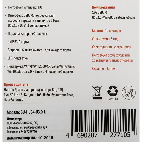 Разветвитель BURO BU-HUB4-U3.0-L 4 порта USB 3.0, черный