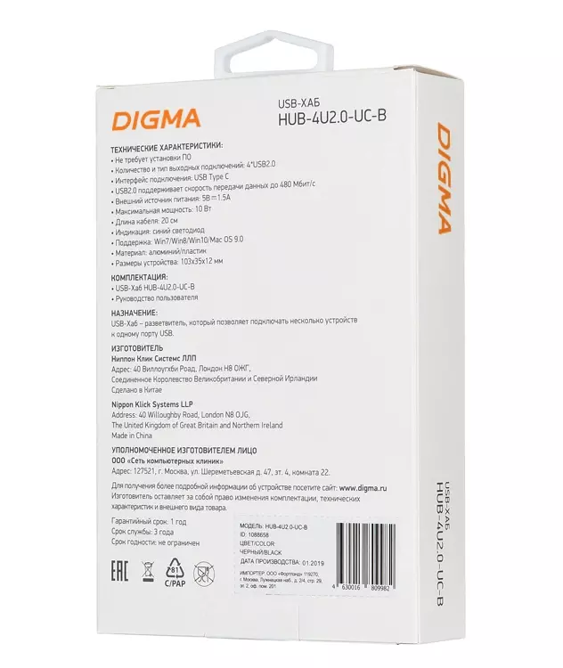 Разветвитель Digma HUB-4U2.0-UC-B 4порт. черный