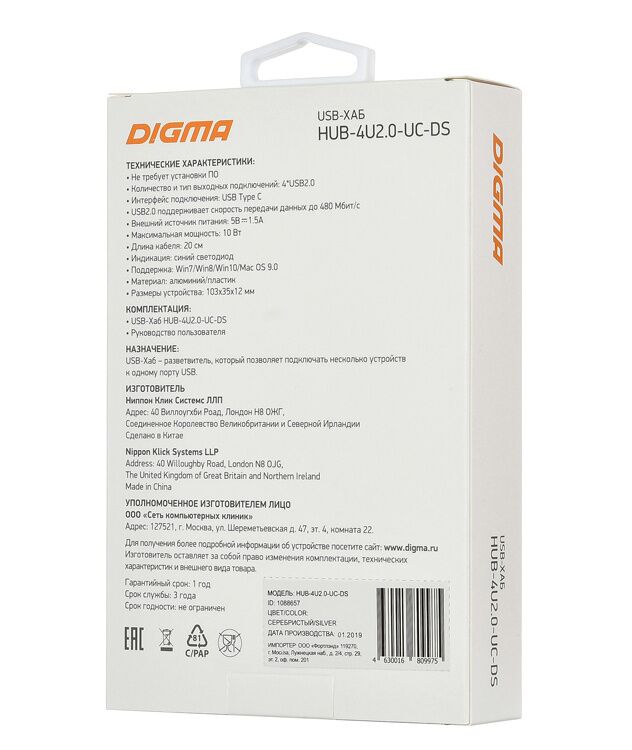 Наличие товара Digma HUB-4U2.0-UC-DS