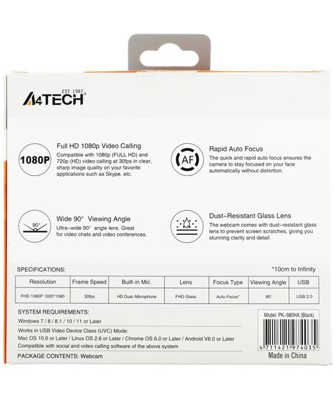 Камера Web A4-Tech PK-980HA черный 2Mpix (1920x1080) USB2.0 с микрофоном